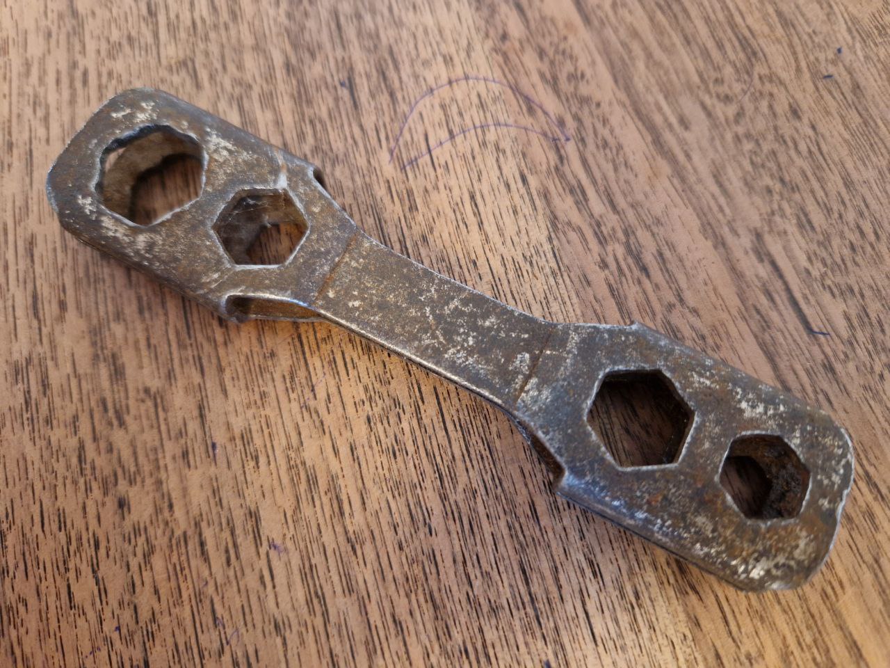 Der Schlüssel zeigt noch Reste seiner ursprünglichen Verchromung/Vernickelung und besitzt neben den vier Maulschlüsseln auch eine Schraubendreherfunktion. Das Loch sieht nachträglich gebohrt aus.