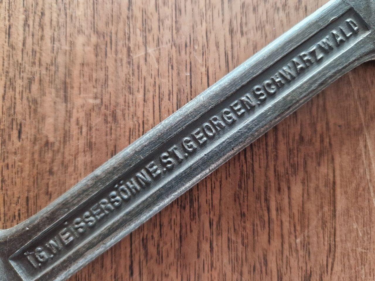 Dieser Maulschlüssel hat mit seiner Markierung mit Unternehmensnamen samt Ortschaft und Region: „i.G.WEiSSERSÖHNE.ST.GEORGEN.SCHWARZWALD“ die Recherche über seine Herkunft sehr kurz gehalten: Das Unternehmen wurde 1856 in St. Georgen im Schwarzwald als Maschinenfabrik J.G. WEISSER SÖHNE