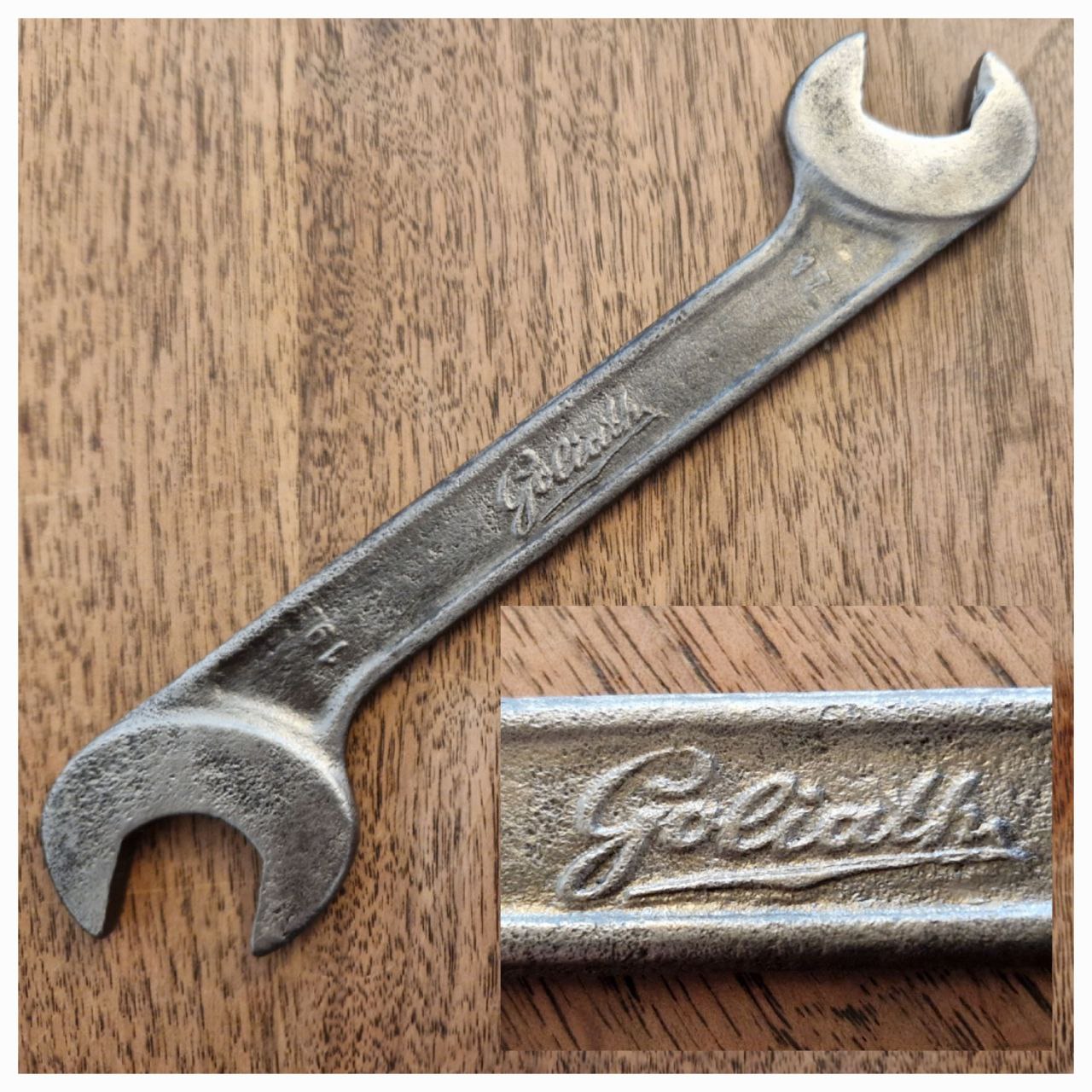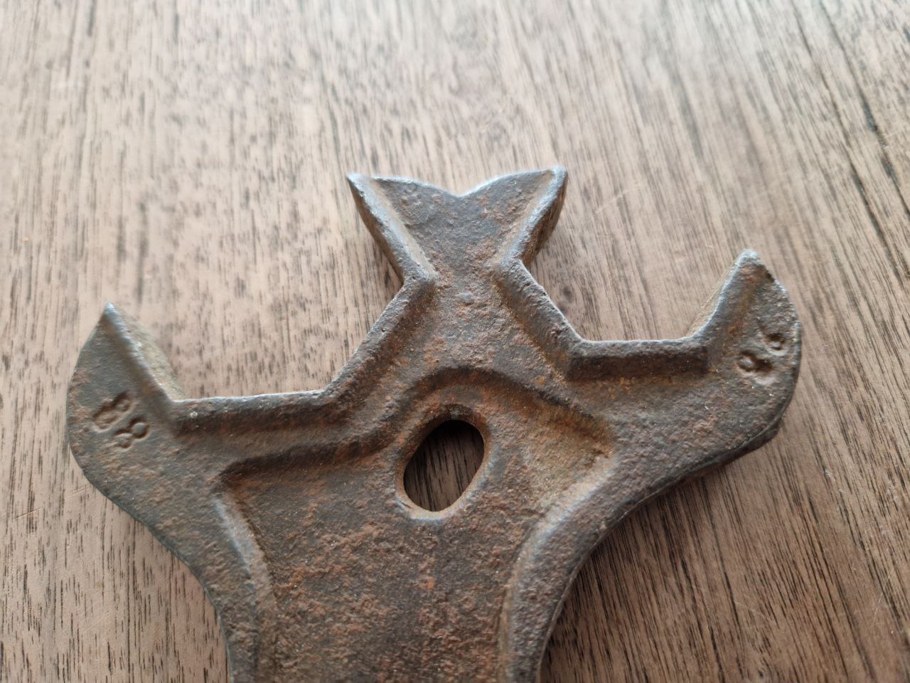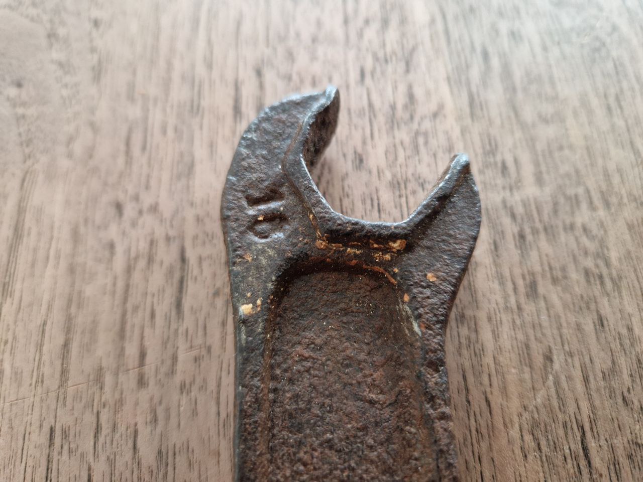 Interessant finde ich neben der netten Markierung, mit den Größenangaben "15" und "18" mit Stern, die Gebrauchsspuren: Wie bei frühen Stücken typisch wurden diese im Laufe ihres Arbeitslebens deren Maulweite angepasst und entsprechend ihrer anfallenden Aufgaben die Mäuler gefräst. Bei diesem Stück hat man sogar auf einer Seite das Maul der Länge nach gekürzt. Da mir die Patina gefiel entfiel die „Drahtbürstendusche“.