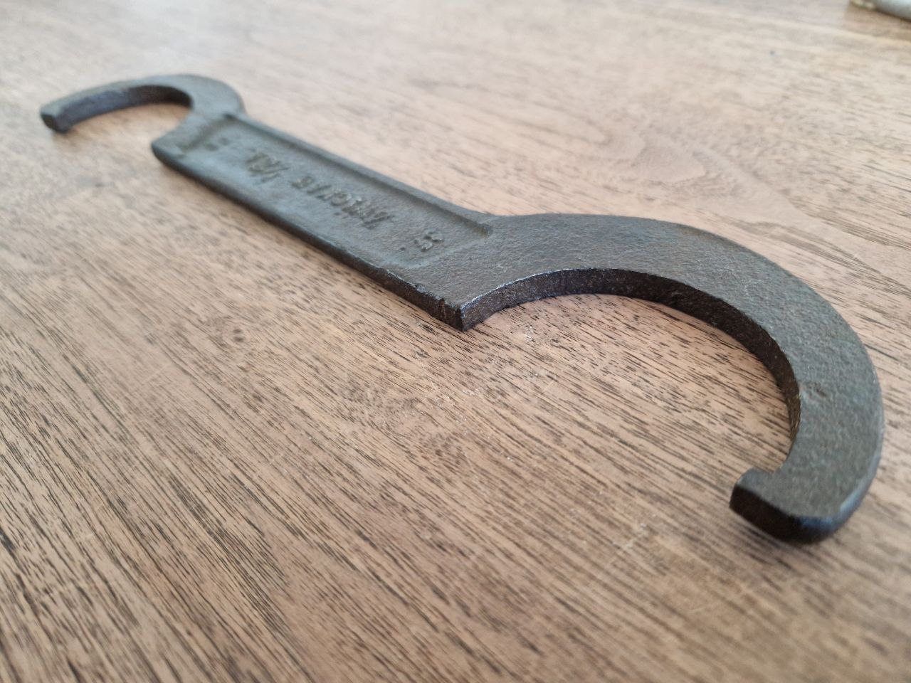 Dieser etwas rostzerfressene Hakenschlüssel von Horch mit 393 Gramm Gewicht und 292 mm Länge ist auf alle Fälle nicht dünnwandig. Er trägt die Markierungen "37" HORCHWERKE A.G. 33." sowie "37. ZWiCKAU i/SA. 33.". Ich finde es ja witzig, dass von all diesen noblen und edlen Karossen in den meisten Fällen am Ende - wenn überhaupt - nur die Werkzeuge übrig geblieben sind.