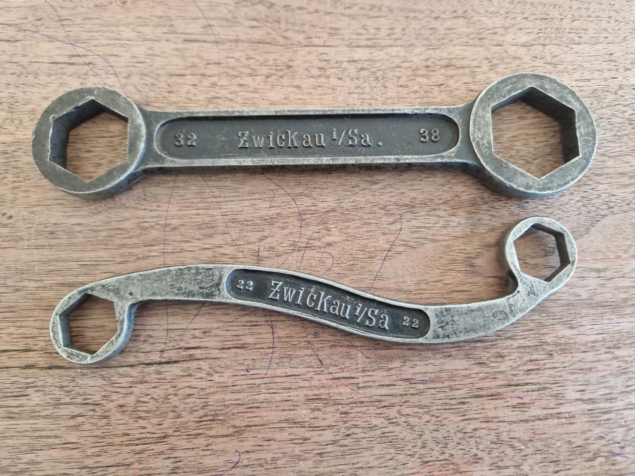Und hier die "neuen" Horchschlüssel, die in meine Sammlung gefunden haben, der gerade misst 251 mm und wiegt 430 Gramm, der Geschwungene bekommt 239 Gramm auf die Waage und streckt sich auf 226 mm: Man sieht sehr schön, dass die Vertiefungen in den Stücken wohl allesamt tiefschwarz lackiert (?) waren, die Schriftzüge hingegen nicht. Die beiden geschwungenen Ringschlüssel sehen auf den ersten Blick identisch aus, allerdings hat der Hersteller das oben bereits vorgestellte Stück (214 Gramm und 222 mm) an den Fassungen beidseitig sehr dünn geschliffen, während das neue Stück lediglich eine plangeschliffene Naht und abgerundete Ränder aufweist. Aufgrund der relativ akkuraten Arbeit schließe ich auf herstellerbedingte Arbeiten – möglicherweise für verschiedene Fahrzeugmodelle. Zuletzt grüßt der Horchschlüsselsalat!