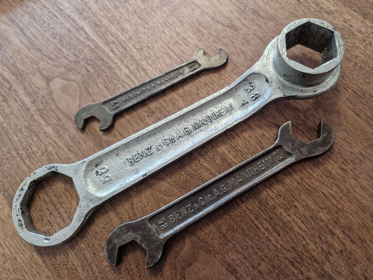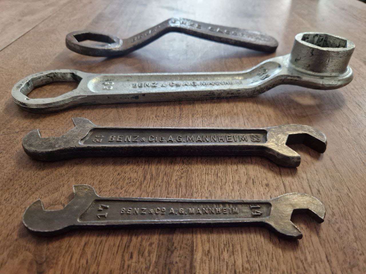 Benzwerke Gaggenau zu sprechen: Eigentlich habe ich diesen Schlüssel als schnödes Tauschobjekt für einen Händler gegen einen begehrten Horchschlüssel erworben – der Händler wollte unbedingt mit einem Bordwerkzeug der Benzwerke Gaggenau tauschen: Das Werk in Gaggenau wurde bereits 1894 gegründet und produziert seit 1895 Fahrzeuge – es darf sich daher als das älteste bis heute produzierendes Werk der Welt für Fahrzeugbau betiteln. Ab 1907 kam die damalige Benz & Co ins Spiel: nach dem Einstieg übernahm 1912 Benz vollständig das Werk von der Süddeutschen Automobil-Fabrik, welches sich zwischenzeitlich auf LKW und Omnibusbau spezialisiert hatte. Das erklärt auch die Größe des Schlüssels von 300 mm und 902 Gramm Gewicht.