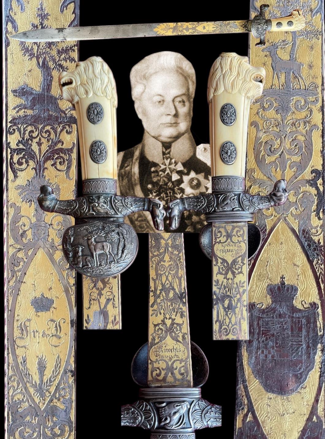 Prächtiges Jagdmesser des Herzogs von Anhalt-Köthen, 1827 Material (Jagdmesser): Damaszenerstahl (teilweise versilbert und vergoldet), versilbertes Metall, Knochen, rote Glassteine Material (Scheide): Leder, versilbertes Metalldekor Solingen, Deutschland, 1827 Werkstatt Peter Knecht (1798-1852) – Waffenhersteller und -händler aus Solingen Auf der einen Seite der Klinge signiert und beschriftet „P. Knecht. IN SOLINGEN“ sowie mit dem Monogramm des Herzogs verziert Auf der anderen Seite der Klinge beschriftet und datiert „Knechts Damast 1827“ sowie mit dem Wappen des Herzogs verziert Länge (mit Scheide): 73 cm Gewicht: ca. 1,1 kg Guter Zustand Prächtiges Jagdmesser von Friedrich Ferdinand, Herzog von Anhalt-Köthen (1769-1830); Das Artefakt ist aus Damaszenerstahl und wurde speziell für den Herzog hergestellt. Friedrich Ferdinand, Herzog von Anhalt-Köthen, war ein preußischer General, der über ein anhaltinisches Herzogtum namens Anhalt-Köthen regierte. Nach dem Tod seines Vaters im Jahr 1797 übernahm er die Regierung des Fürstentums Pleß und seit 1818 die Regierung des Herzogtums. Er war Ritter des Ordens vom Goldenen Vlies und besaß eine exklusive herzogliche Sammlung. Das vorliegende Jagdmesser ist ein beeindruckendes Artefakt, das dem Herzog gewidmet ist. Die einschneidige Damaszenerklinge ist mit Goldornamenten verziert und zeigt das herzogliche Wappen, seine Initialen und die Signatur des Herstellers Peter Knecht aus Solingen. Der versilberte Parierring zeigt Jagdmotive und der geschnitzte Griff zeigt einen Löwenkopf. Die Scheide ist aus schwarzem Leder und weist ein reiches versilbertes Metalldekor auf. Das Jagdmesser ist in gutem Zustand, wenn man sein Alter berücksichtigt. Die Klinge ist leicht von Flugrost betroffen und die versilberten Teile erscheinen etwas geschwärzt. Der Griff aus Elfenbein weist einen feinen Haarriss auf und zeigt ein leicht gelöstes Metallstück. Auf dem Löwenkopf fehlt ein roter Glasstein. Die Lederscheide weist leichte Alters- und Gebrauchsspuren auf und das Beimesser fehlt. Die Gesamtlänge des Stückes beträgt 73 cm und es wiegt ca. 1,1 kg.