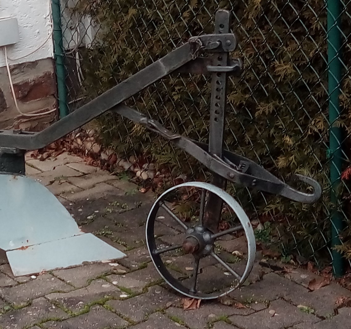 Vorne in den Haken wurde das Zugtier eingehängt (Rindvieh, Esel, Pferd), hinter dem Pflug, diesen lenkend, lief der Bauer (Manchmal auch er ein Rindvieh oder Esel! ;) ) Die Löcher in der Stange über dem Rad dienten natürlich dazu, die Bearbeitungtiefe des Pfluges einzustellen.