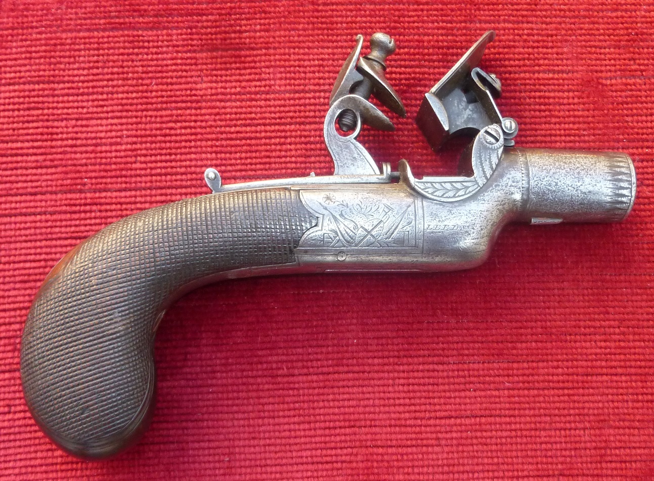 In dieser Form sind solche Pistolen wohl nicht so häufig, besonders als Paar. Ein weiteres schönes Beispiel für die zum Teil sehr ausgefallenen Designs unserer Freunde von den britischen Inseln!