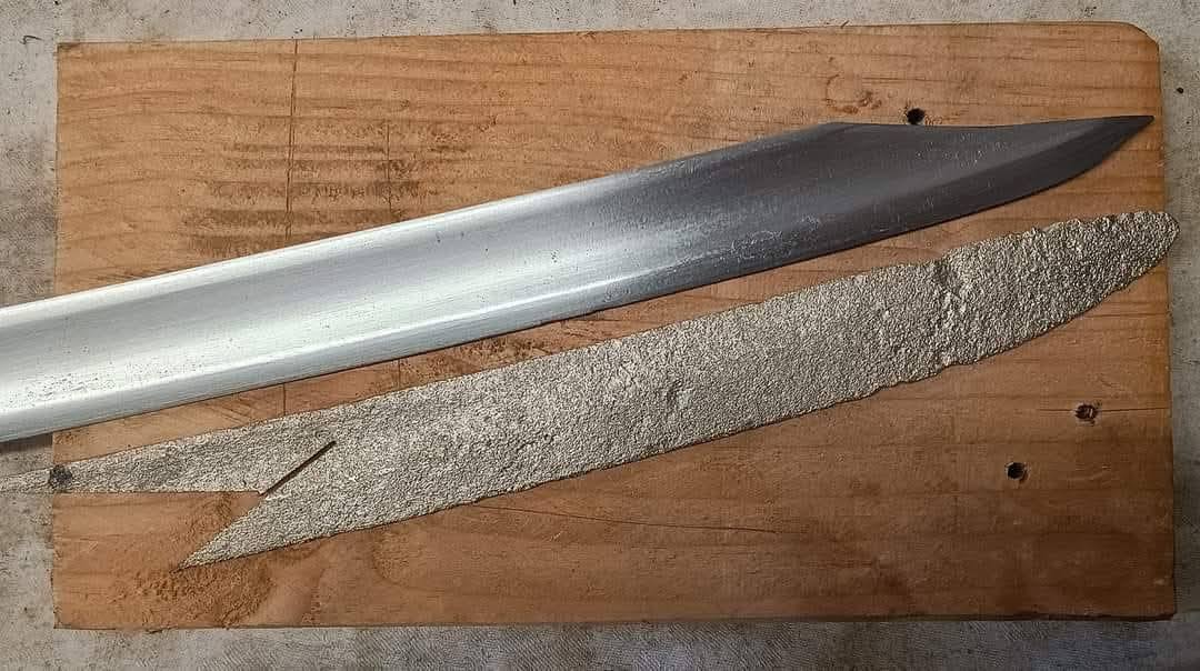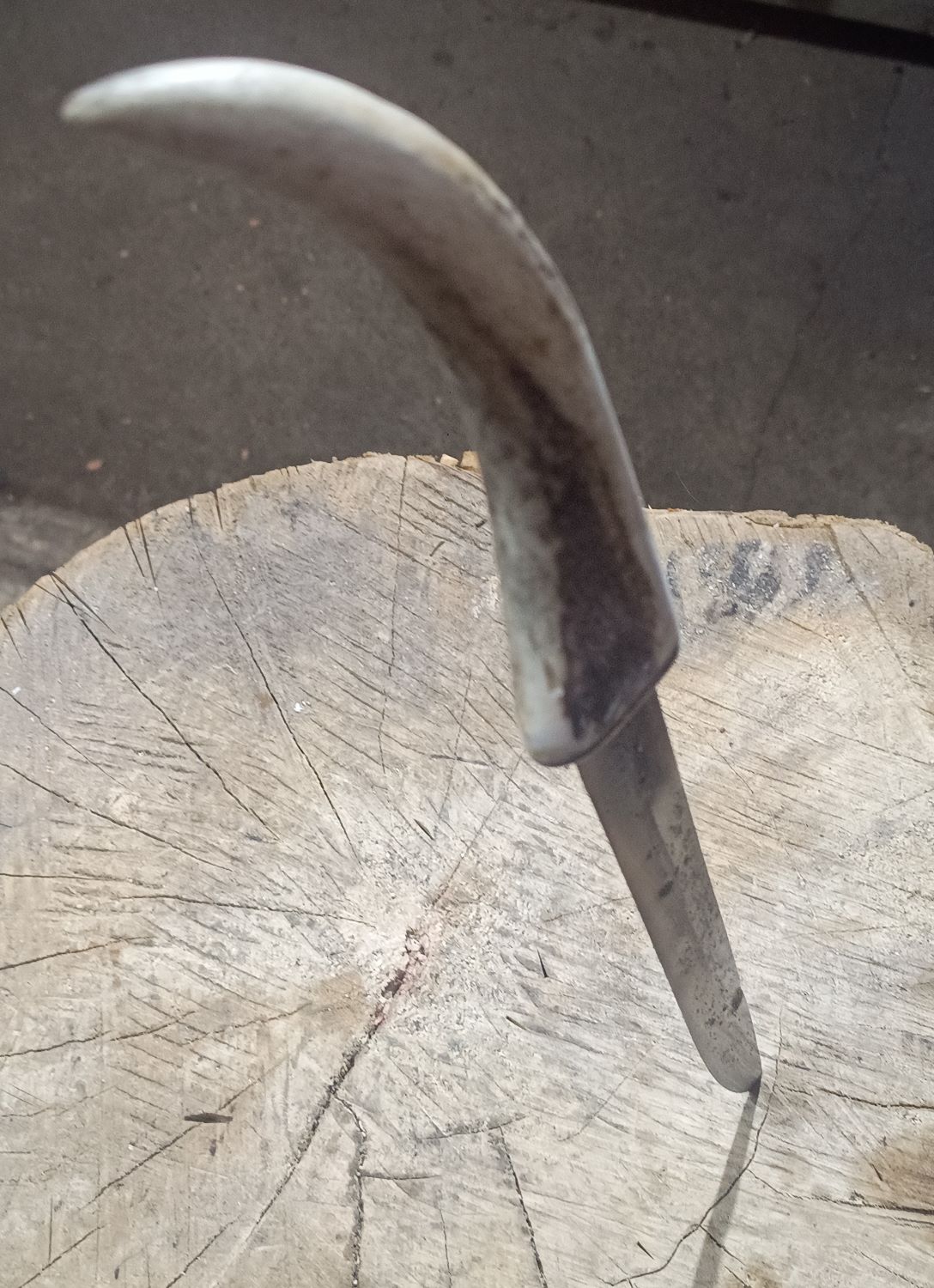 Bauernwehr-Jagdsäbel-Hybriden blieb die schlecht erhaltene Klingenspitze übrig. Irgendwo hatte irgendwer die Idee, dass man aus der stark narbigen Klingenspitze noch ein Messer machen könnte.