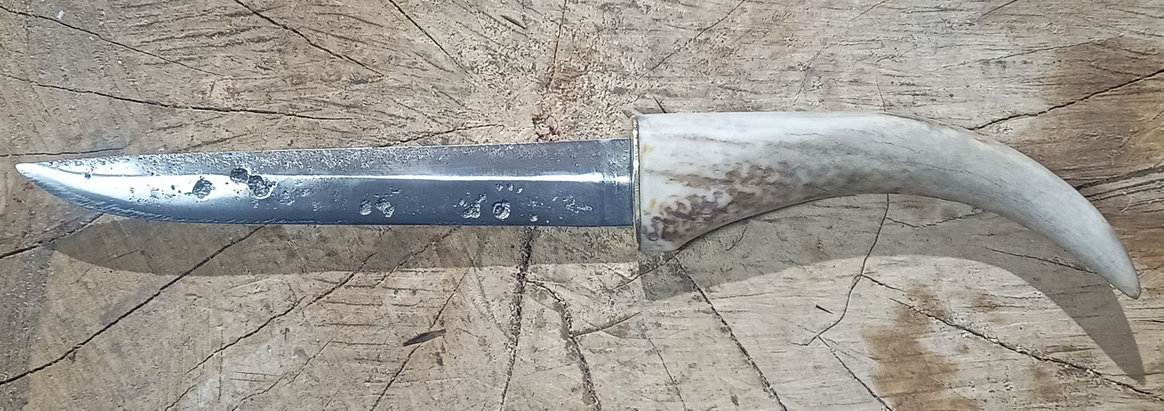Bauernwehr-Jagdsäbel-Hybriden blieb die schlecht erhaltene Klingenspitze übrig. Irgendwo hatte irgendwer die Idee, dass man aus der stark narbigen Klingenspitze noch ein Messer machen könnte.