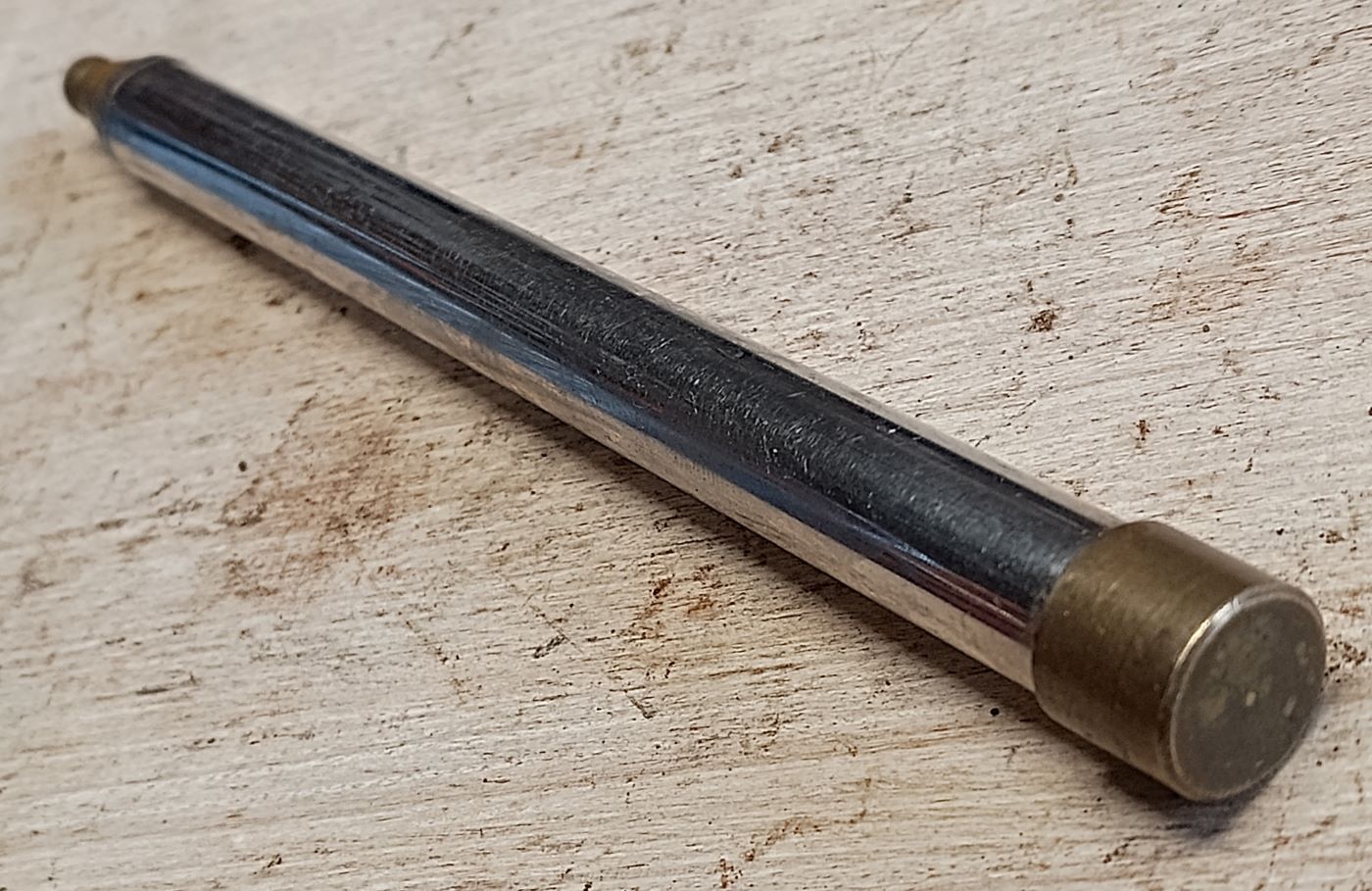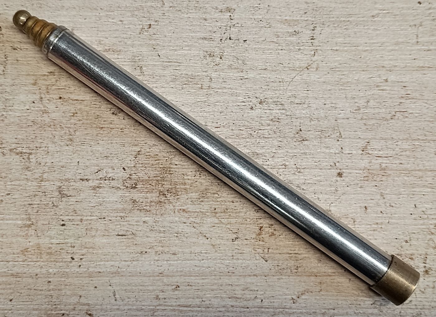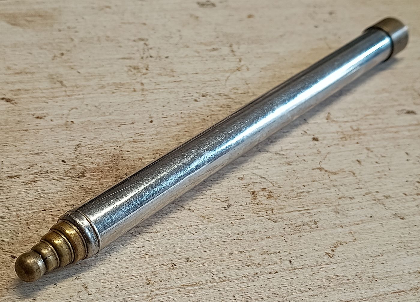 Den kenne ich schon seit meiner Kindheit. Er befand sich, bis zur Übernahme des Haushalts meiner Großeltern, immer in der unteren Küchenschrankschublade. Ja genau, in dieser einen Schublade, die immer die interessantesten Dinge enthielt. Ausgezogen ist er etwa 625 mm lang. Ich habe keine Ahnung, wer ihn aus der Familie und warum benutzt hat. Einige, die dieses Teil gesehen haben meinten, es sein eine umfunktionierte Teleskopantenne. Aber, einerseits spricht aus technischer Sicht nichts für eine derartige Verwendung und andererseits gab es zu der Zeit keine (mobilen) Transistorradios bei uns.