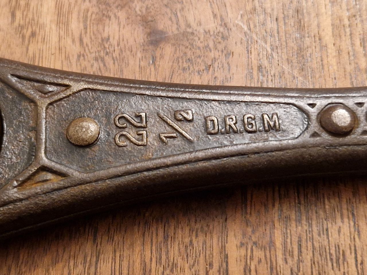 In diesen Beitrag stelle ich einen alte Knarre in der Form als Ringschlüssel mit 242 Gramm Gewicht und 21,3 cm Länge vor. Dessen Vernietungen hüten das Geheimnis seiner Funktionsweise. Die D.R.G.M. und D.R.P.a. Markierungen grenzen den