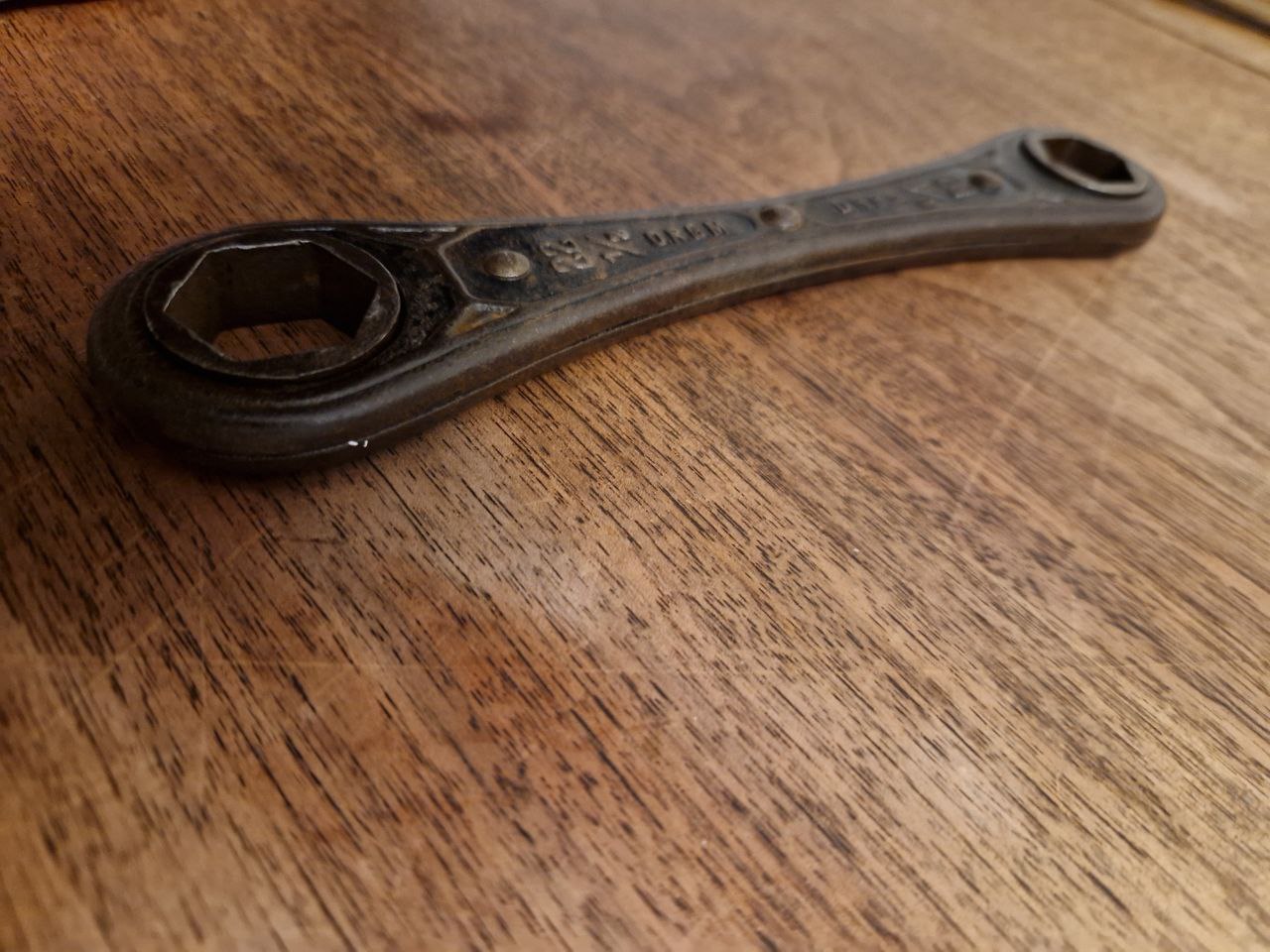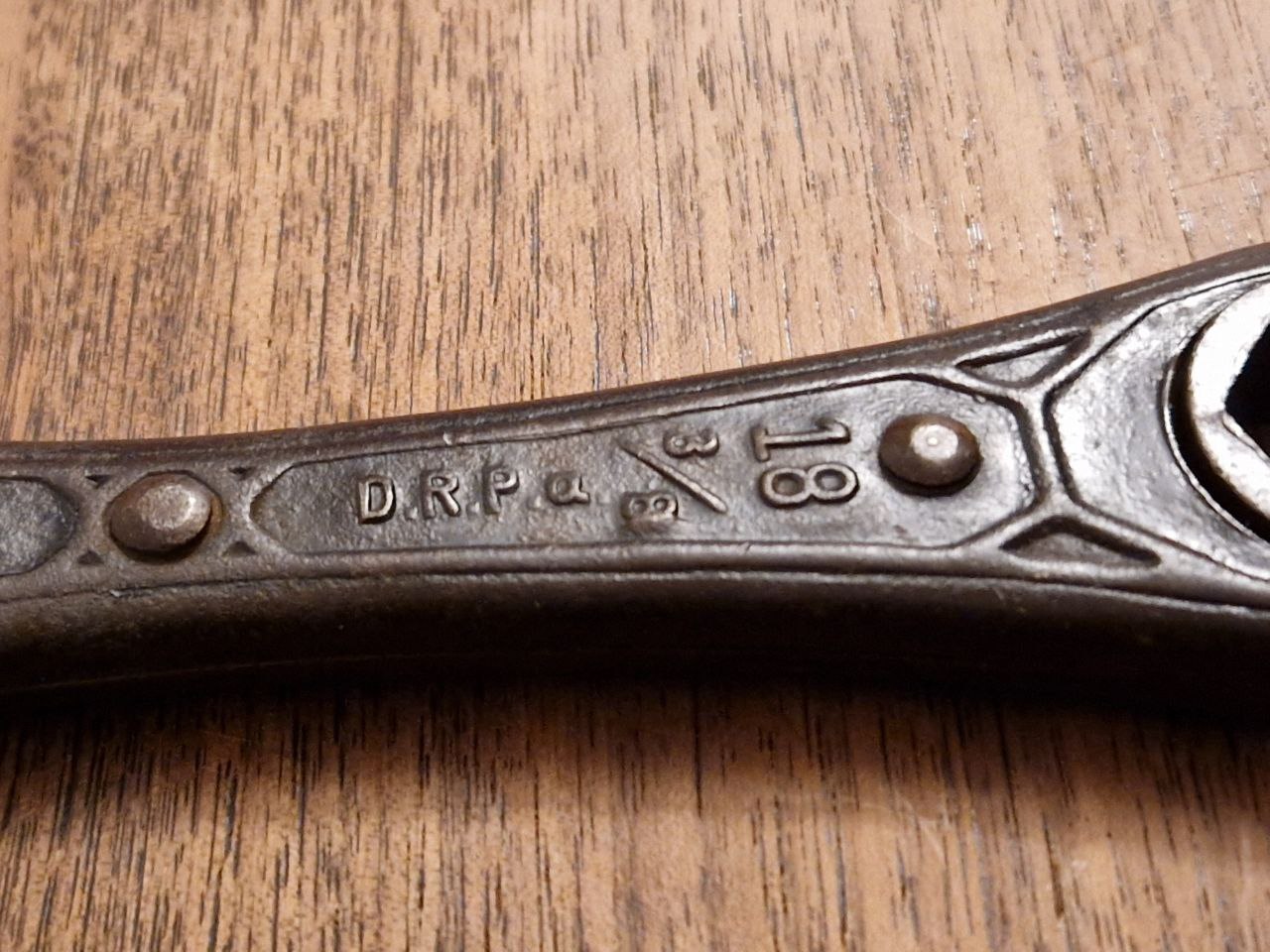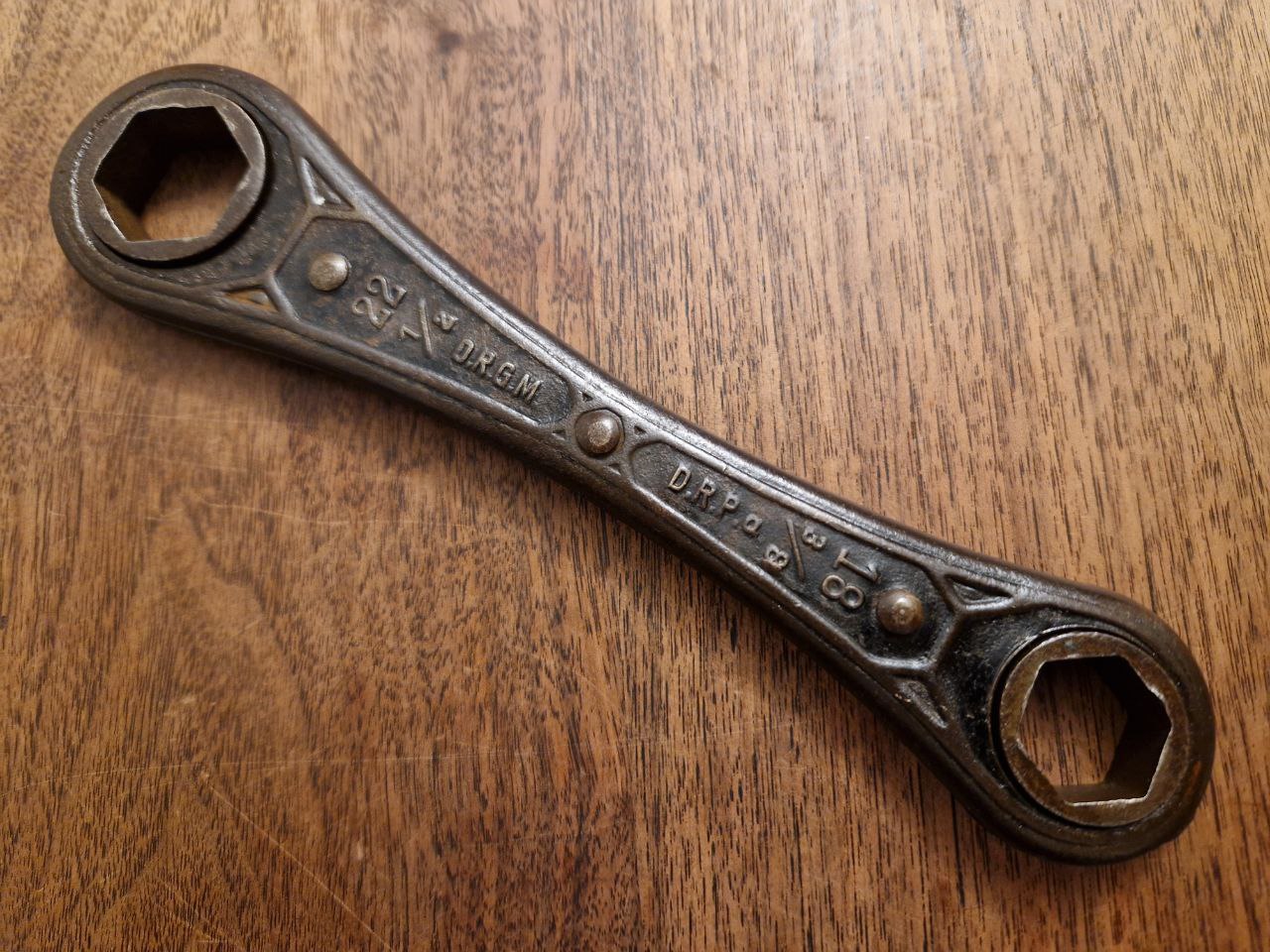 In diesen Beitrag stelle ich einen alte Knarre in der Form als Ringschlüssel mit 242 Gramm Gewicht und 21,3 cm Länge vor. Dessen Vernietungen hüten das Geheimnis seiner Funktionsweise. Die D.R.G.M. und D.R.P.a. Markierungen grenzen den