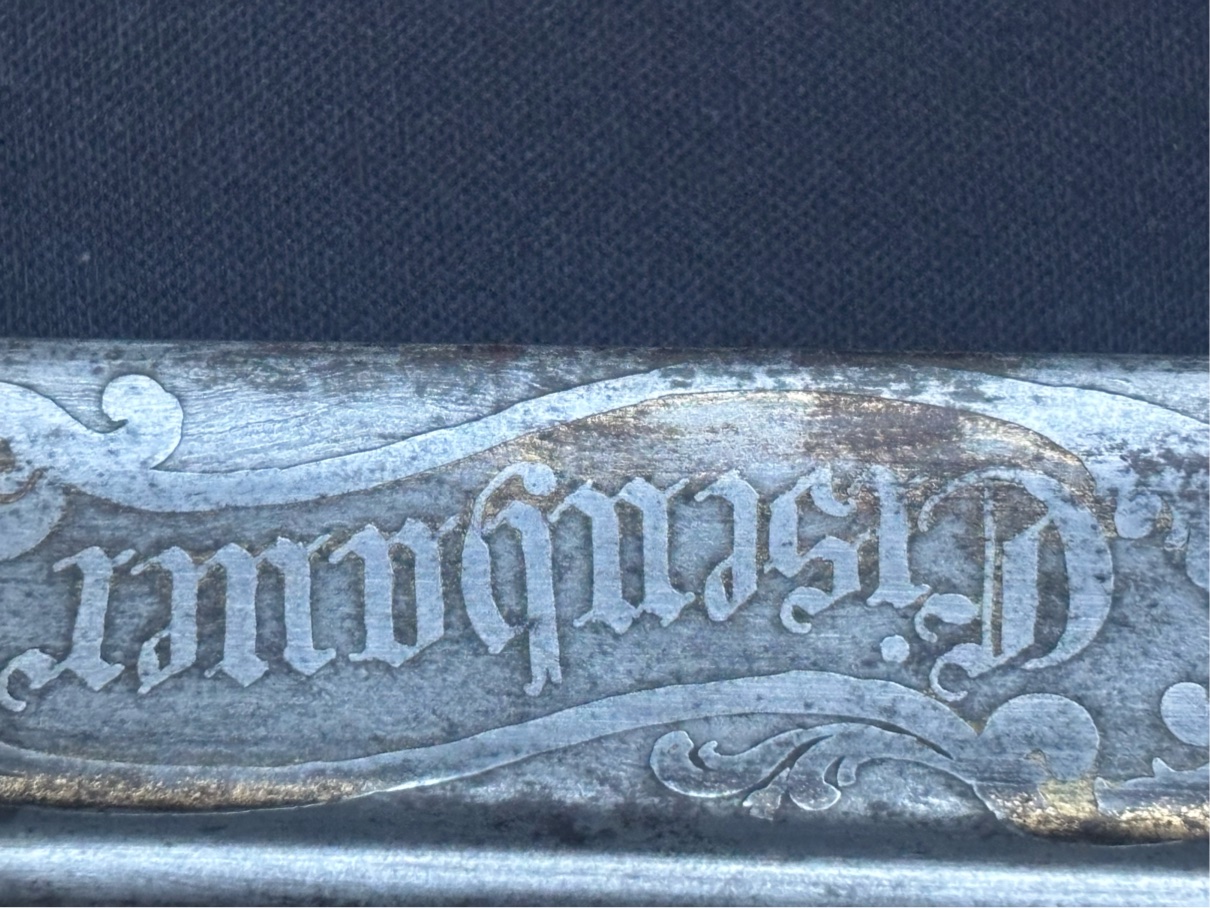 Bei den Mecklenburgern ist die Situation für Mitglieder des Arbeitskreises Blankwaffen (oder den Lesern der Tagungen hier im Forum) klar. Der Säbel für berittene Infanterie-Offiziere wurde auch dort geführt. Dazu gehören dann aber Embleme auf der Scheide, seltener auf dem Griff, sowie in (späteren Jahren) auch auf Mecklenburg weisende Klingenätzungen.