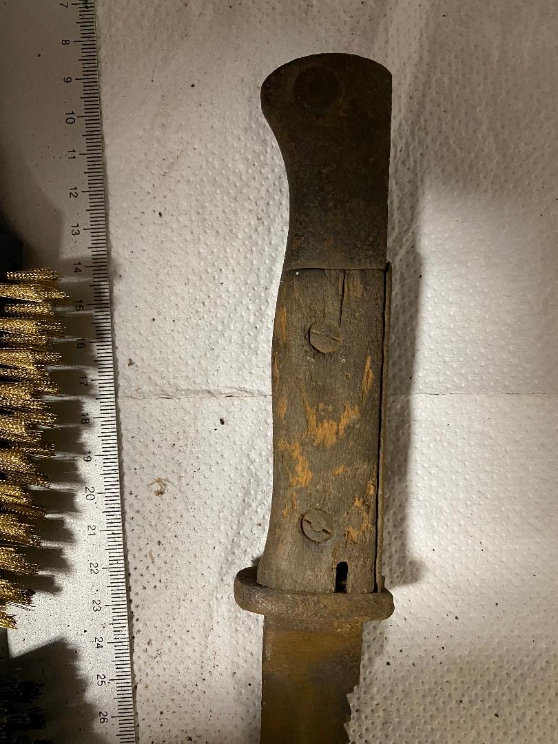 mir ist beim Aufräumen des Gartenhauses meiner Eltern unter allerlei altem Werkzeug ein Seitengewehr mit Sägerücken in die Hände gefallen. Mein Vater meinte, dies sei das Bajonett seines Vaters (Jahrgang 1907) aus dem Zweiten Weltkrieg gewesen. Ich kenne mich nicht sehr gut mit Blankwaffen aus, jedoch scheint mir das Teil in Art und Ausführung etwas älter. Eine oberflächliche Recherche führte mich zum Modell SG14, welches dem vorliegendem Seitengewehr zumindest ähnelt. Die Oxidation an der Oberfläche ist leider soweit fortgeschritten, dass ich keine Hersteller- oder Prüfmarken erkennen kann. Ich habe jedoch Bilder angehängt, die eine Identifizierung vielleicht ermöglichen.