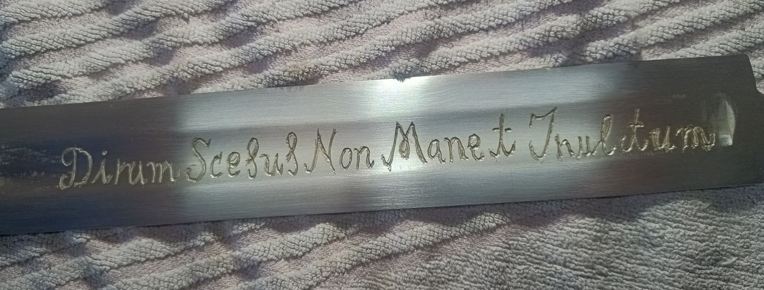 Eine schon gehärtete Klinge mit Hohlkehlen und Gravuren zu versehen ist aufreibend aber nicht unmöglich. Die Hohlkehlen hätte es nicht gebraucht, aber ich wollte ja auch mal testen wie es gehen kann.