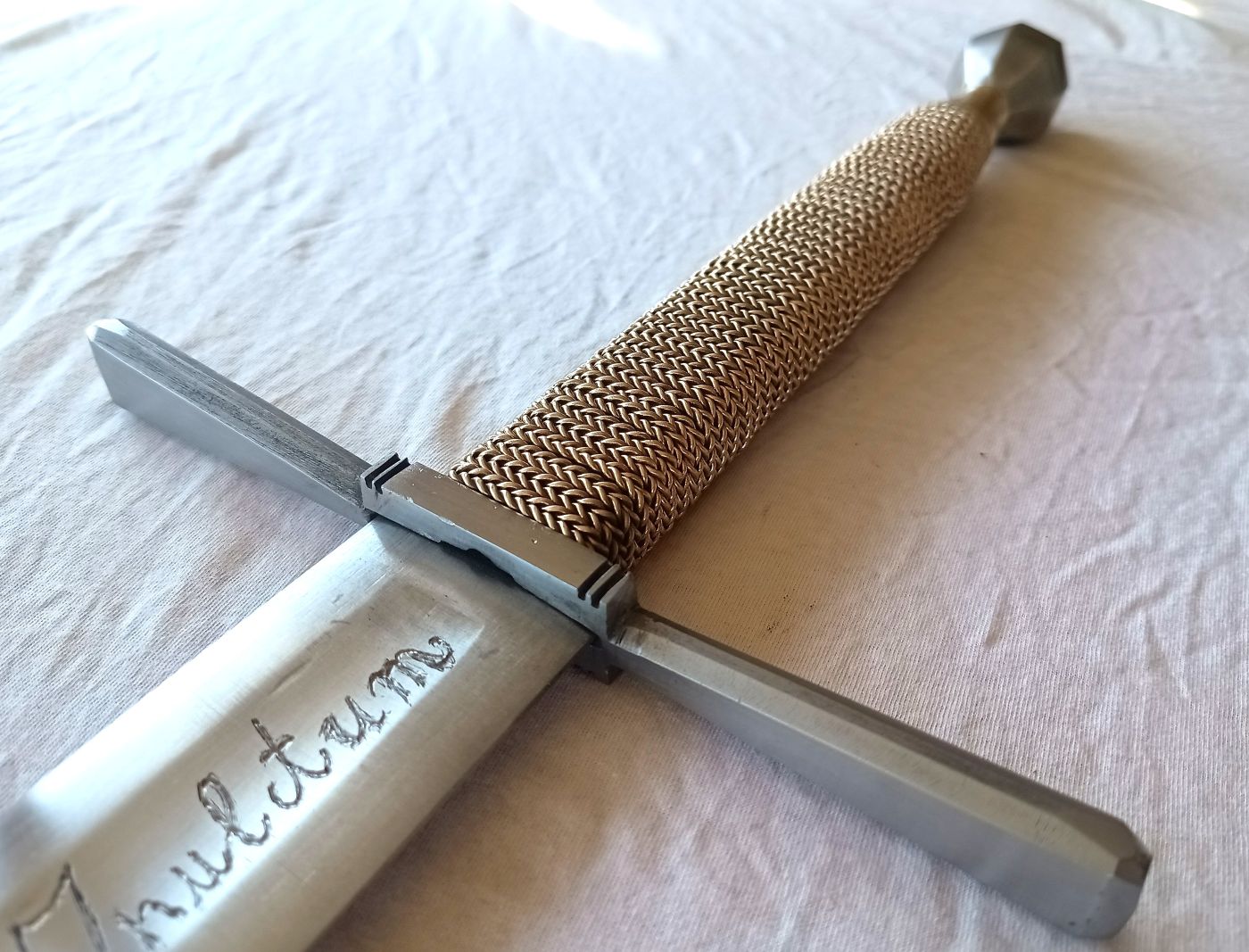 Die Griffwicklung sollte eng anliegender, verdrillter Messingdraht werden. Als Einzeldraht war er noch schön weich, aber so eng verdrillt entpuppte er sich dann ziemlich hart und widerspenstig. Kurz vor dem Ende, da wo die Hilze schmaler wird, musste ich ihn mittels Verlöten fixieren und mit dem Wickeln aufhören. Das mit dem nicht mehr umwickelten Ende habe ich dann anders gelöst.