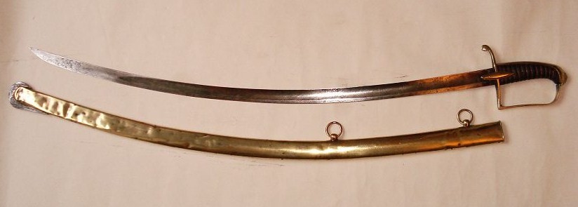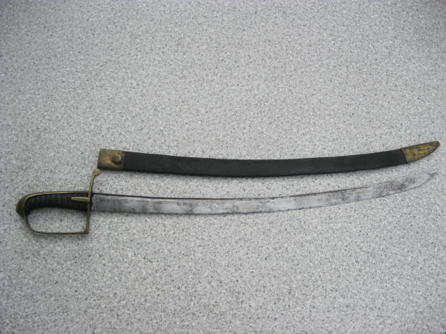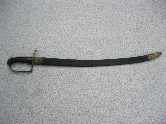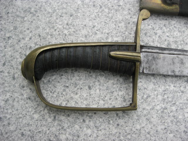 Hier ein Stück mit einem ähnlichen Griff,aber verheiratet mit einer älteren Klinge.Dieser kurze Infantriesäbel weißt keinerlei Marken od.Stempel auf.Mitteleisen wurden gekürzt (beidseitig)um die Klinge problemlos in die Scheide zu bekommen.Diese Mariage wurde schon vor langer Zeit durchgeführt