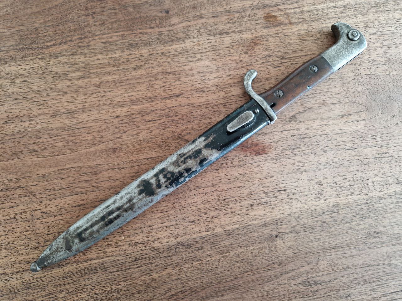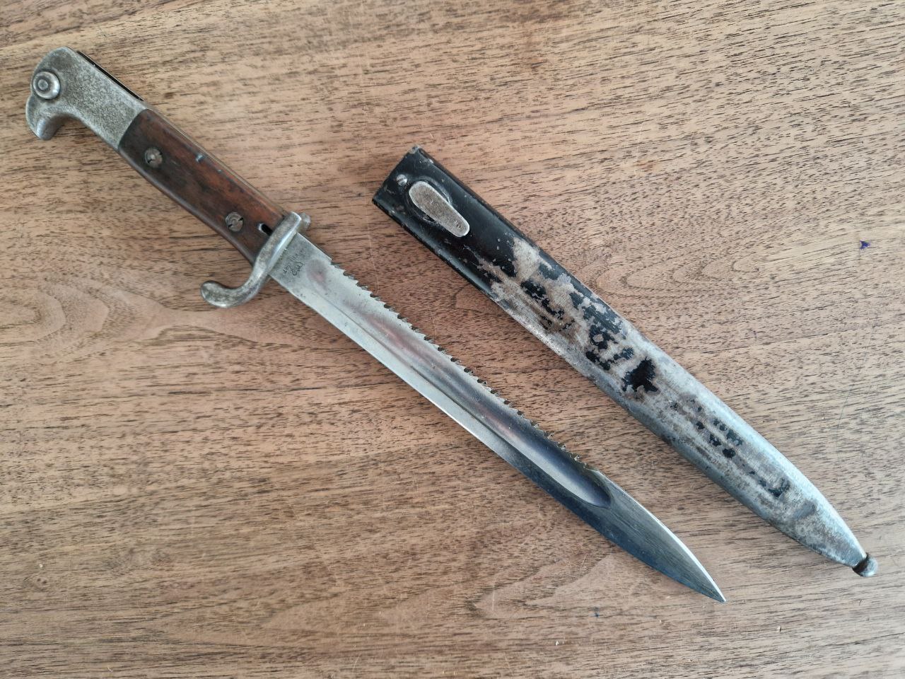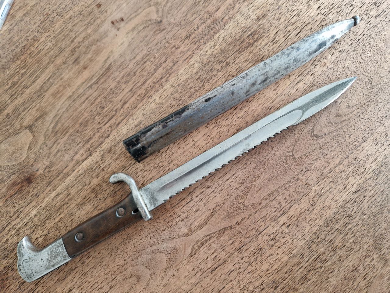 Scheide sollte eine S84/98nA sein, wenn spaeter als 1914 hergestellt, kann aber sein es zeitlich passt mit KS98,am hacken ist oben mit inspektor stempel krone/E? bestempelt , das pfeil ist wohl der hersteller TM, der wurde in 1WK beobachtet an anderen Stuecken. KS98 ist von Erfurt aus 1914 und wurde da korekt mit Krone/V bestempelt.