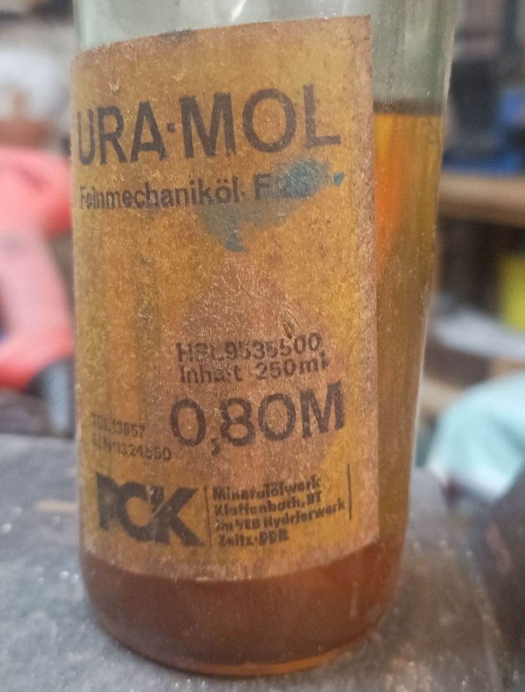 Auf diese Pfütze Öl passe ich auf wie ein Schießhund, denn es ist, aufgrund seiner Konsistenz, auch hervorragend zum Pflegen von Klingen geeignet. Aber wahrscheinlich gibt es das heute noch zu kaufen.