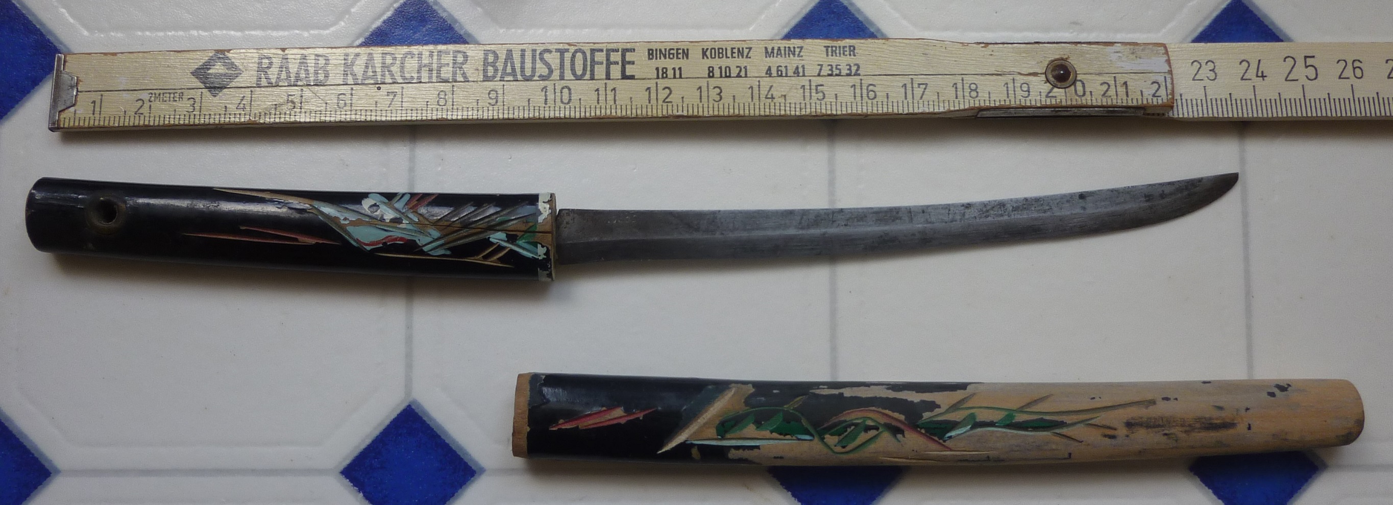 Ha, so ein Teil habe ich auch. Aber schwarz lackiert und mit ein bisserl Kerbschnitt. Der Zustand des Lackes ist allerdings inzwischen lausig, aber die Klinge ist, wie bei Deinem Teil, überraschend scharf. Das Ding liegt bei mir aufgrund der Lackschäden im "Reparieren-Eimer"... :D
