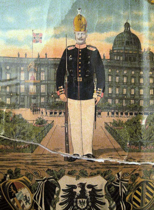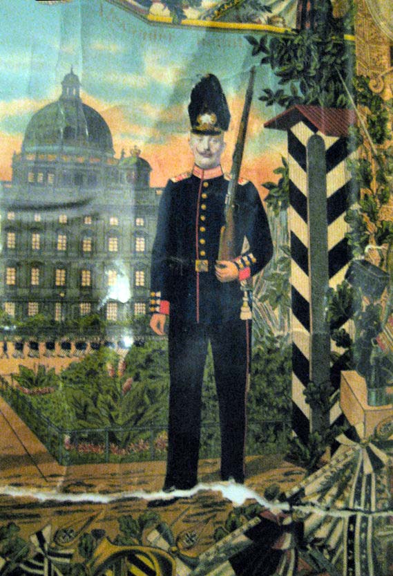 Füsl. August Bürmann (auf dem 2. Gruppenbild links außen stehend) diente von 1904-06 bei der 9. Compagnie des Kaiser Alexander Garde-Grenadier-Regiments Nr. 1 in Berlin. Die beiden Foto-Postkarten oben hat er im September 1915 von Berlin versendet und auf der Rückseite seinen Absender angegeben.