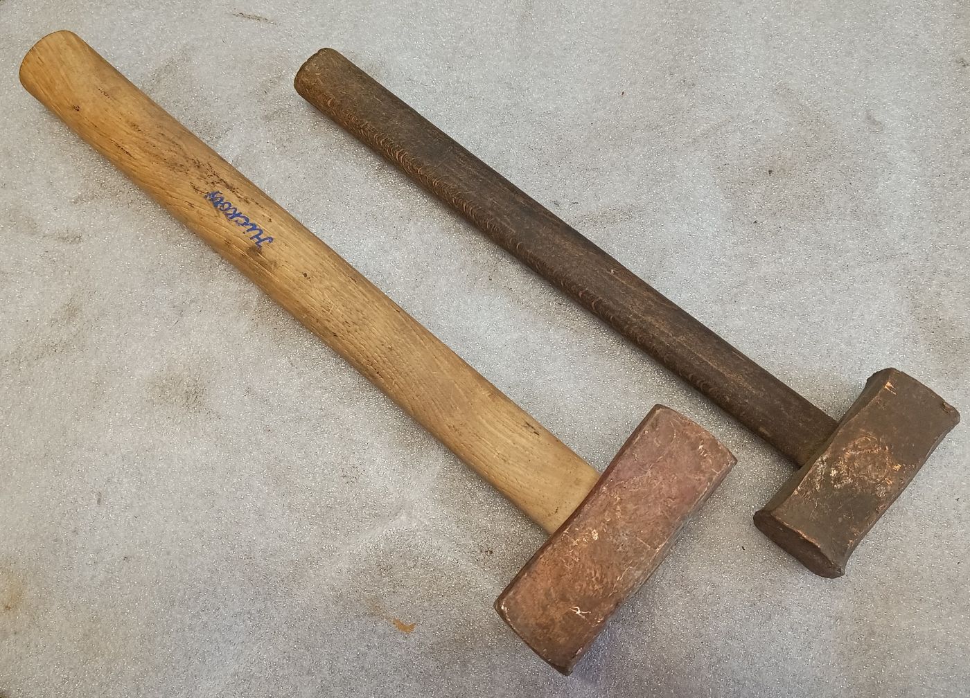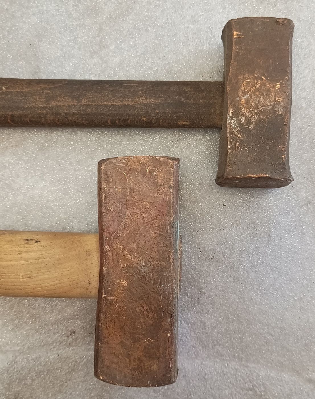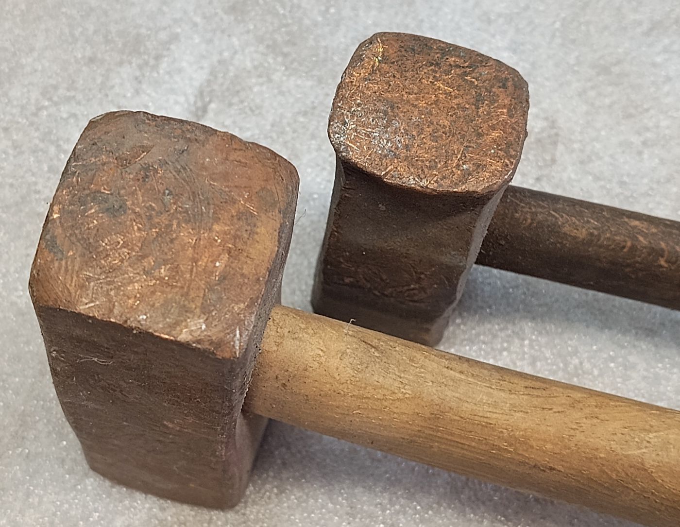 Ernsthaft, wie selten kommt das vor, zwischen den ganzen Standard- und/oder Schlosserhämmern auf Flohmärkte auch mal welche aus Kupfer zu finden? 500 und 1000 Gramm schwer.