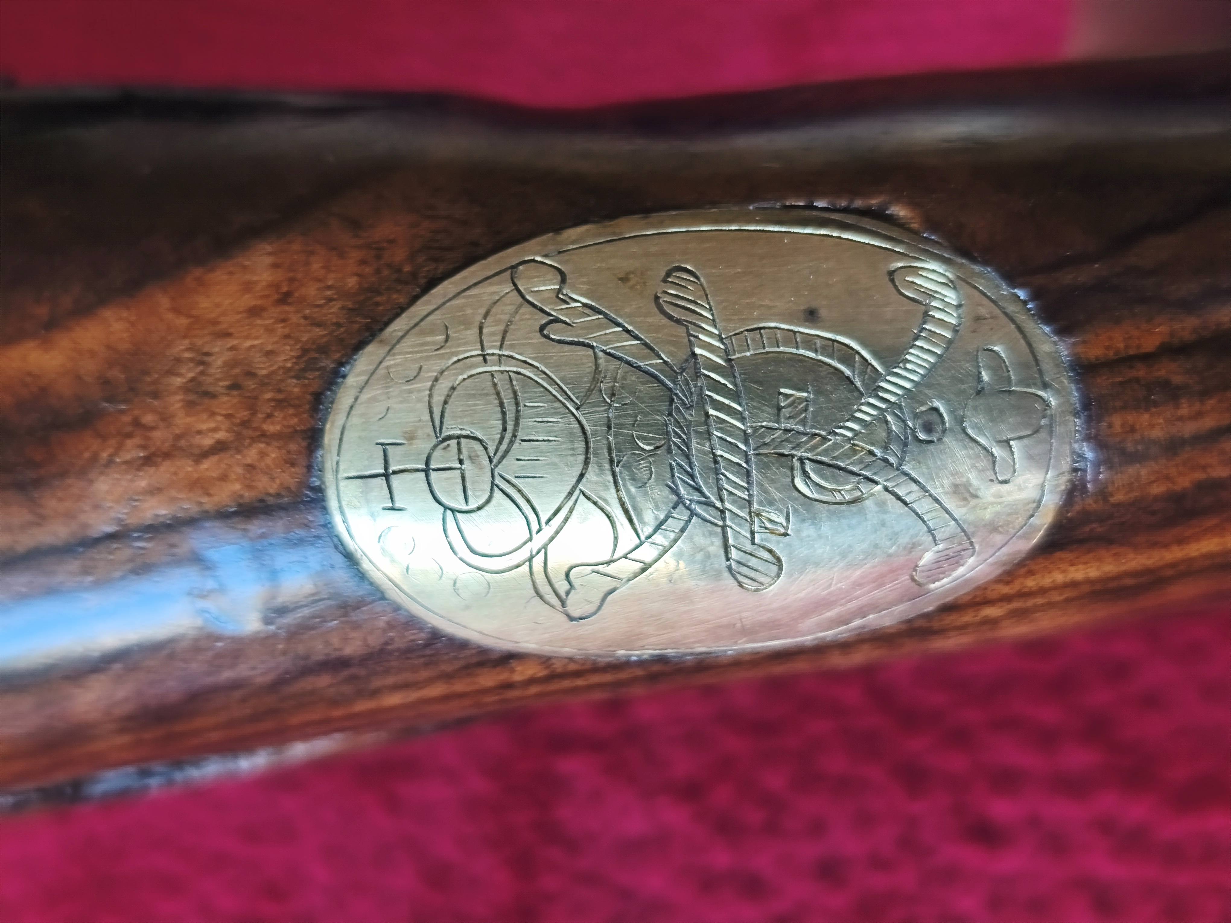 Pistole hat keinen Ladestock, die Gravur von Friedrich dem Großen am Daumenplattl und eine Schlossgegenplatte die ich noch nie gesehen habe. Die Schlossplatte ist mit Potzdamagaz und S&D signiert. Ist diese Zusammensetzung stimmig oder ist das eine Sammlerfertigung?