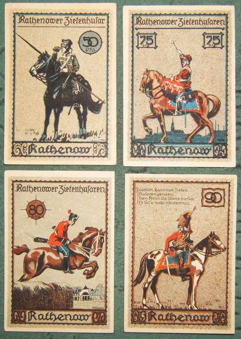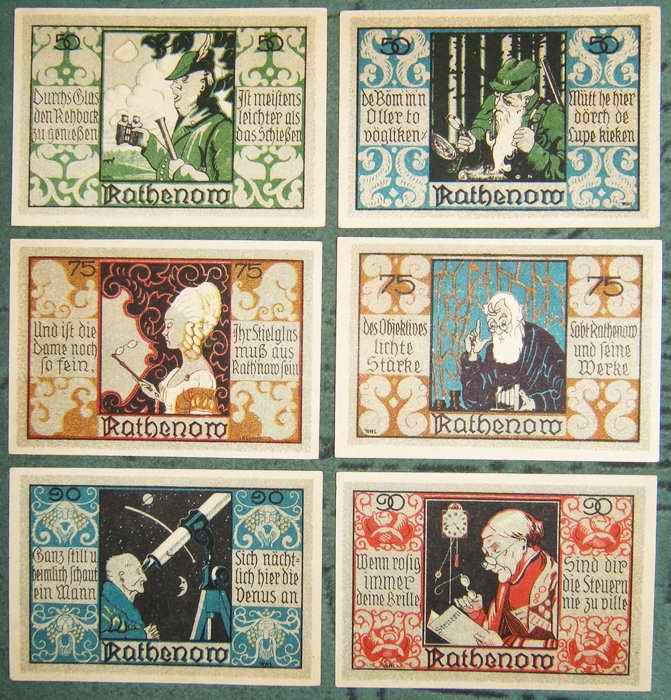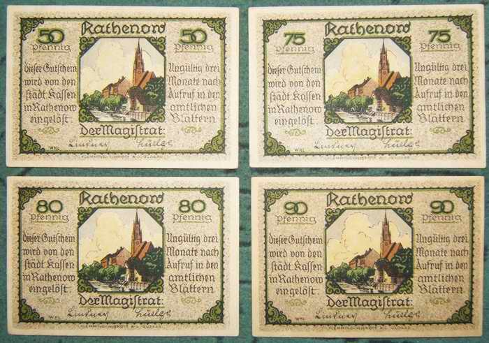 4. Rathenower Gutscheine mit "zivilen" Motiven, ein wenig Lokalkolorit. Jeweils zwei mit 50, 75 und 90 Pfennig.