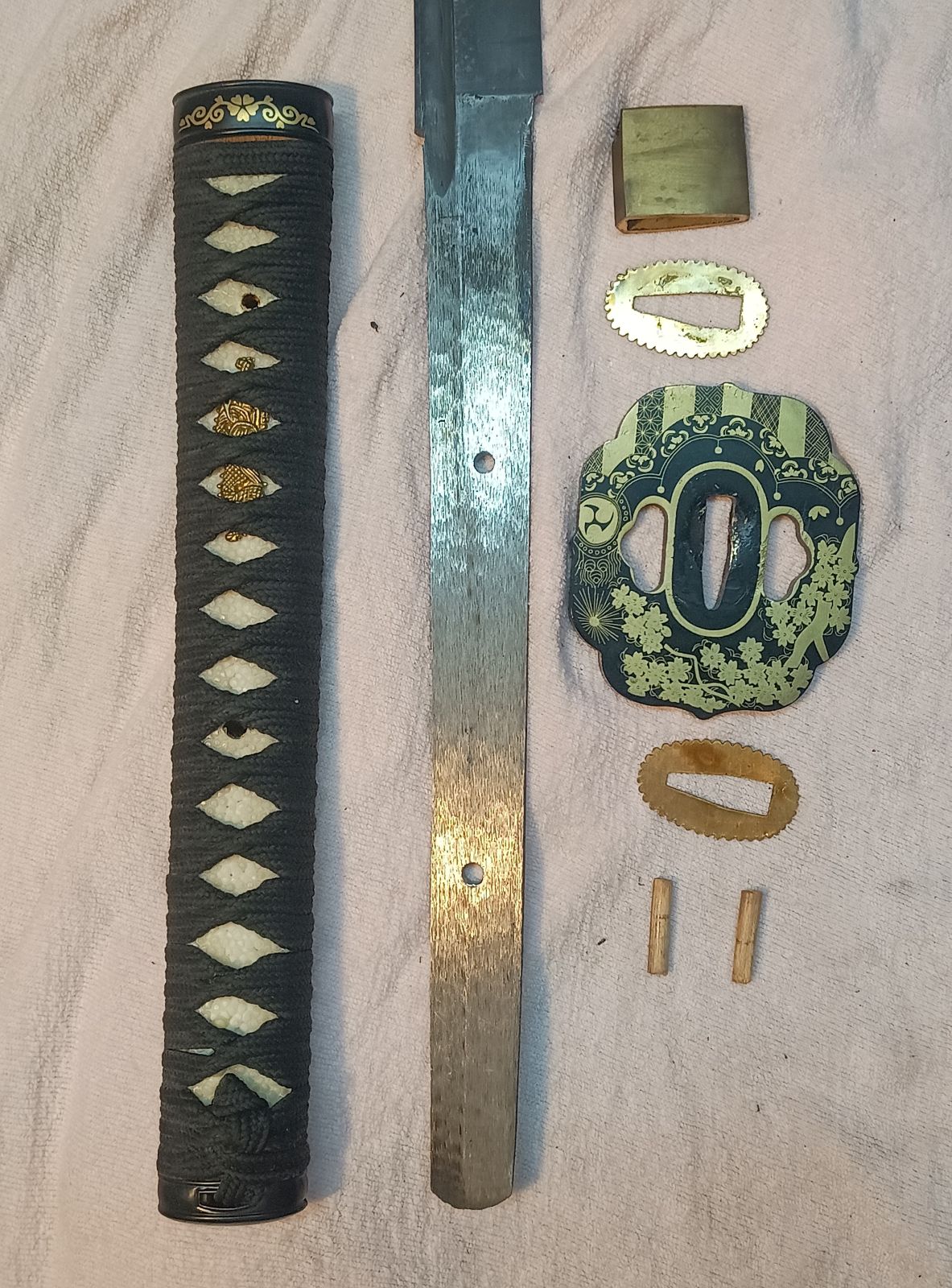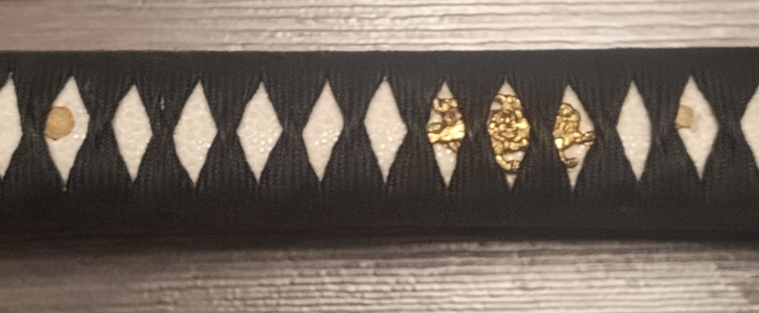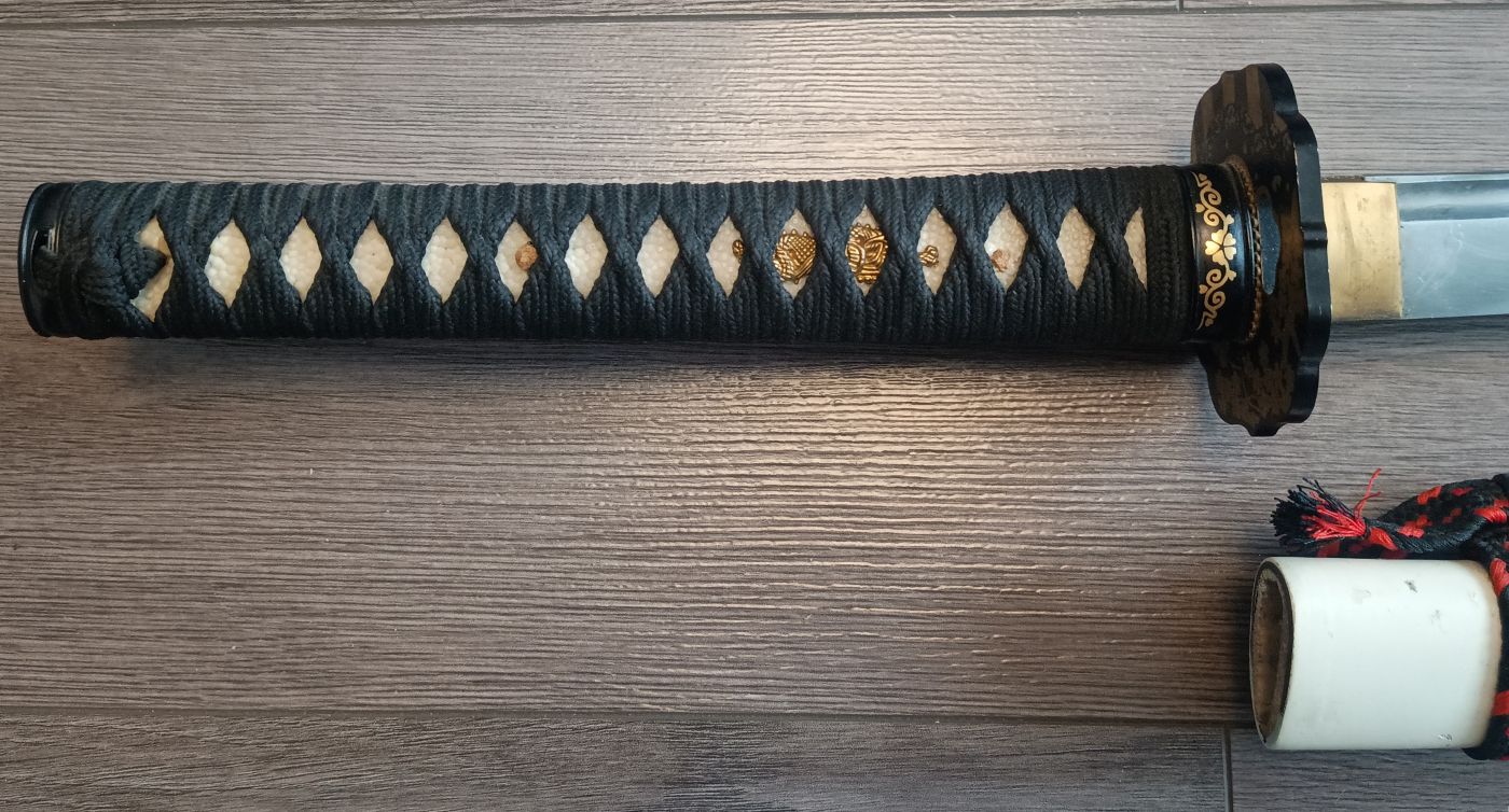 Die Same ist aus echter Rochenhaut und das Tsuka-Ito aus Baumwolle. Tsuka (Griff) und Angel sind mit zwei Mekugi (Bambuspflöcke) verbunden.