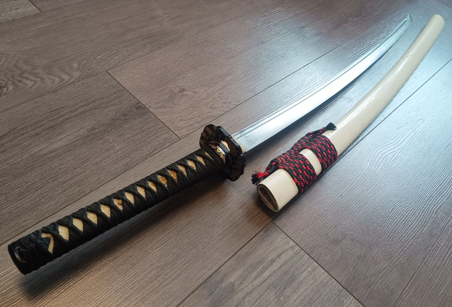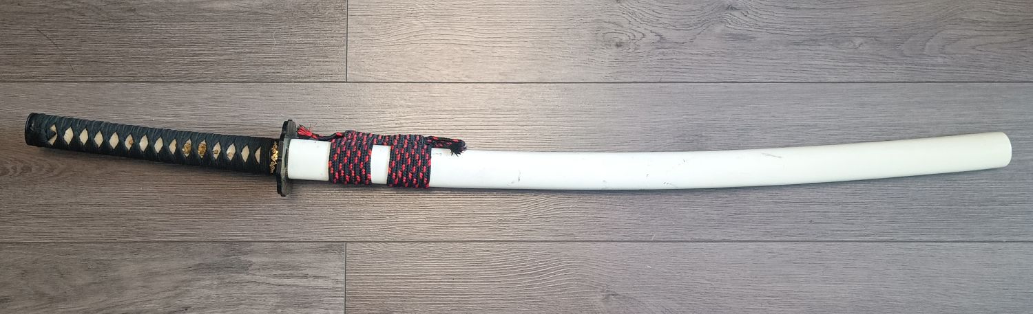 Mir ist der Hersteller nicht bekannt. Der Vorbesitzer hatte es von einem mir "bekannten" deutschen Händler erworben, der mit Schwertern der "Schmiede Zhan" handelt. Die Klinge wäre in diesem Fall handgeschmiedet, aus 1095er Kohlenstoffstahl und mit echter Hamon. Laut Händlerbeschreibung ähnlicher Schwerter dann auch für leichtes Tameshigiri (Schnittests) geeignet. Dem mag ich nicht widersprechen, aber bei mir sind es eh nur Schmückedinger. :D