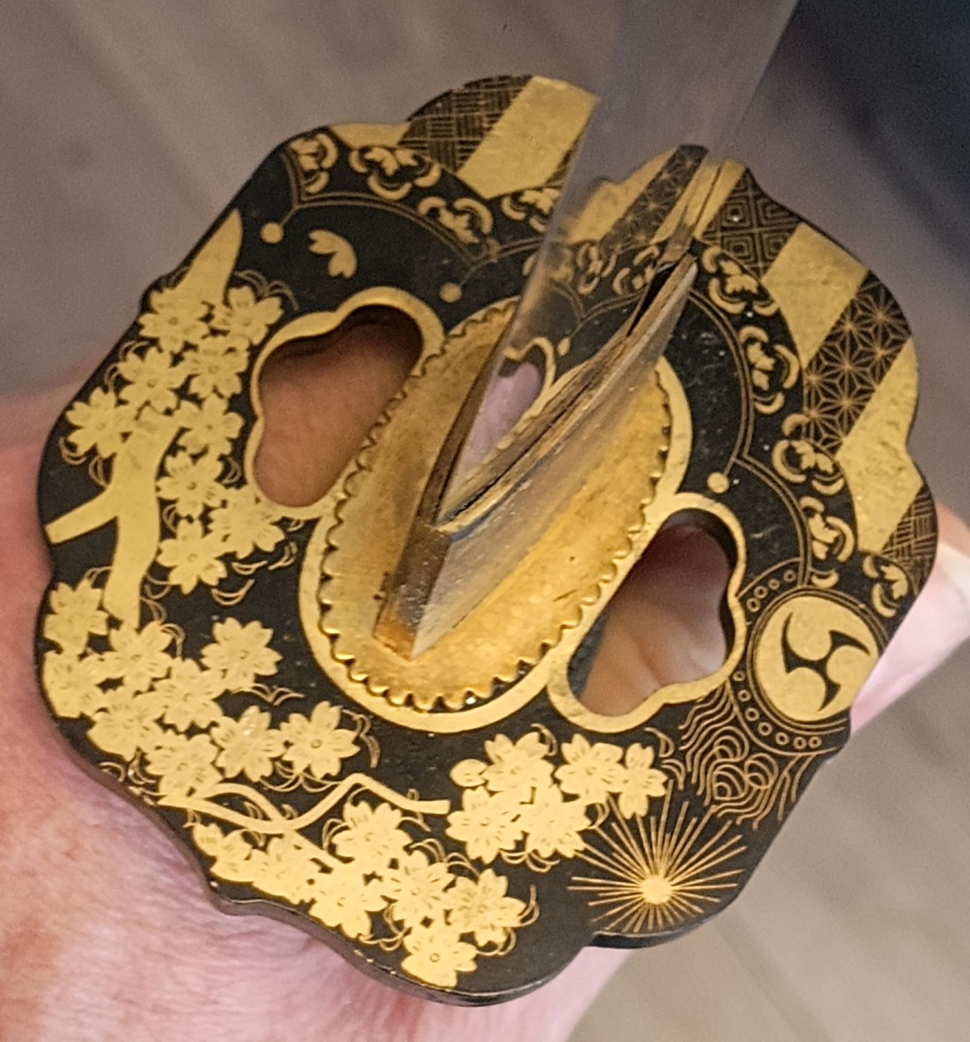 Wollte immer wissen wie es darunter aussieht und wie es funktioniert. Im vorliegendem Fall geht die Tsuka von der Klinge, wie bei einem Original. Bei den Billigschwertern ist sie meist festgeklebt und nicht de- oder montierbar. Die Form der Angel gefällt mir, bis auf einer Kerbe in Höhe des Übergangs zwischen Klingenrücken und Angel (roter Kreis).