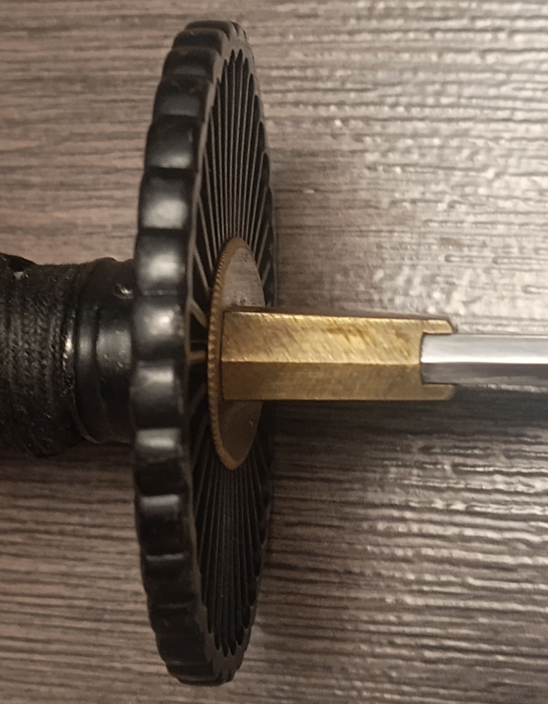Wollte immer wissen wie es darunter aussieht und wie es funktioniert. Im vorliegendem Fall geht die Tsuka von der Klinge, wie bei einem Original. Bei den Billigschwertern ist sie meist festgeklebt und nicht de- oder montierbar. Die Form der Angel gefällt mir, bis auf einer Kerbe in Höhe des Übergangs zwischen Klingenrücken und Angel (roter Kreis).