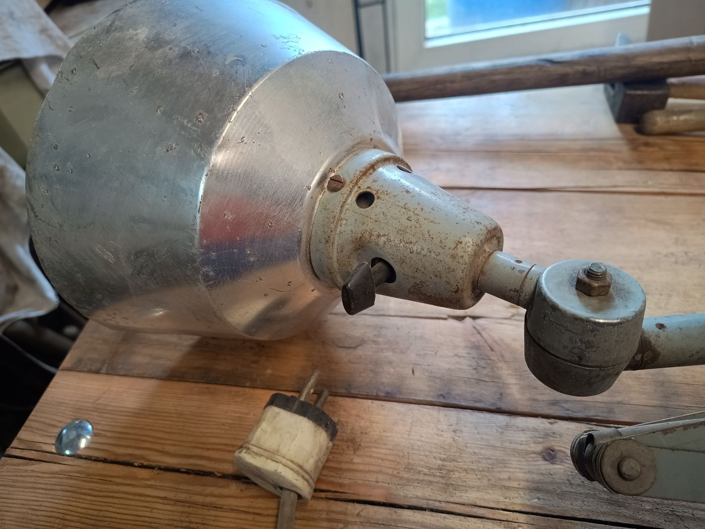 Nr. 2: Die Gelenklampe vom Flohmarkt, mit fehlender Tischhalterung und kaputtem Schalter am Schirm. Als Halterung für den Tisch habe ich noch etwas im Fundus gehabt und den Schalter habe ich komplett entfernt. Schalten geht jetzt über einen schaltbaren Steckdosenadapter.