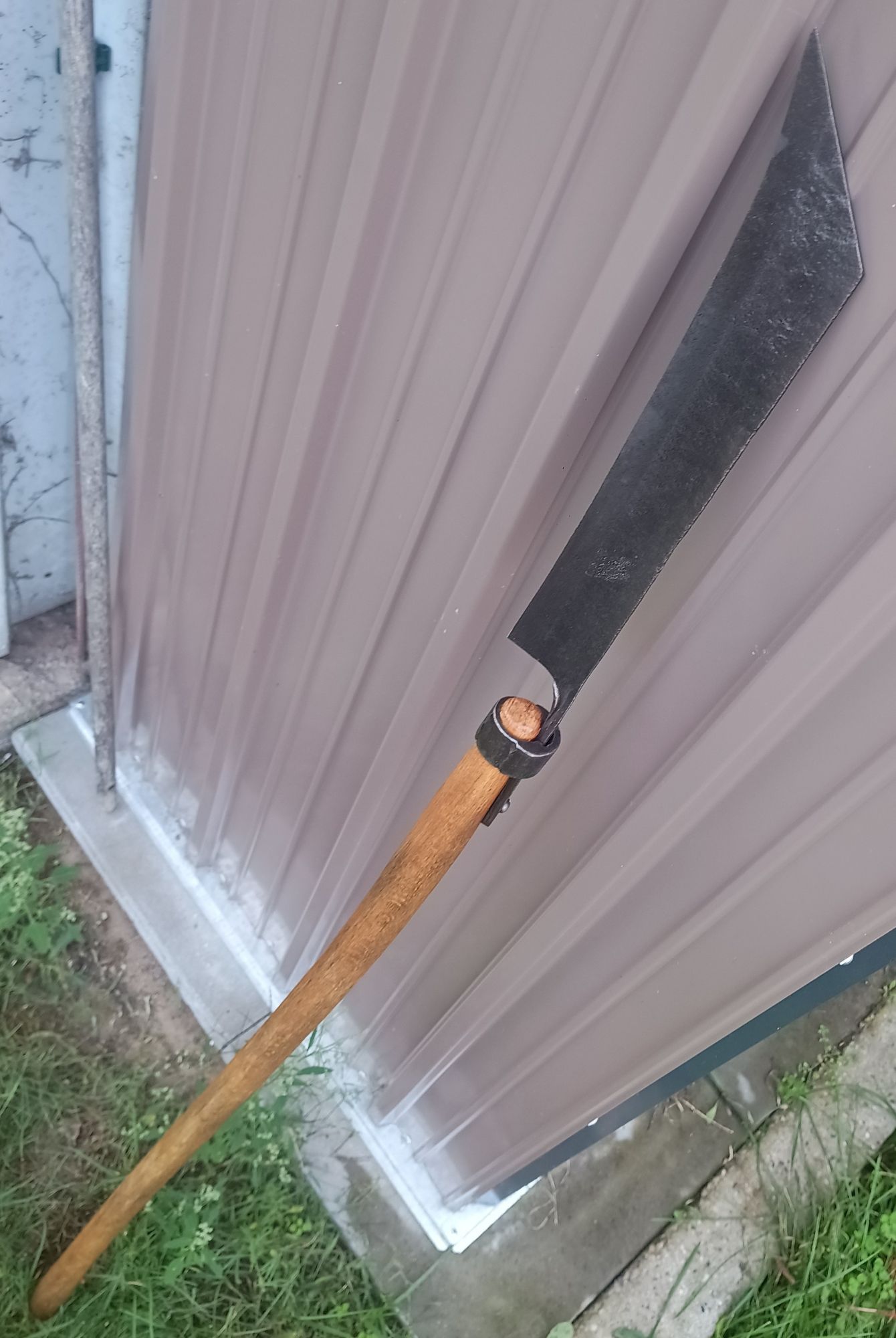 Letzten Sonntag habe ich dieses "Hackmesser" auf dem Flohmarkt erstanden. Aufgrund der zur Klinge quer liegenden Stielbefestigung