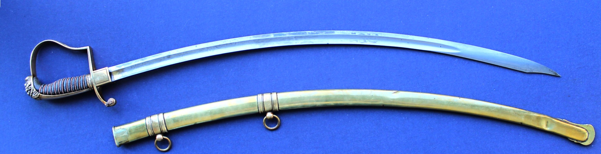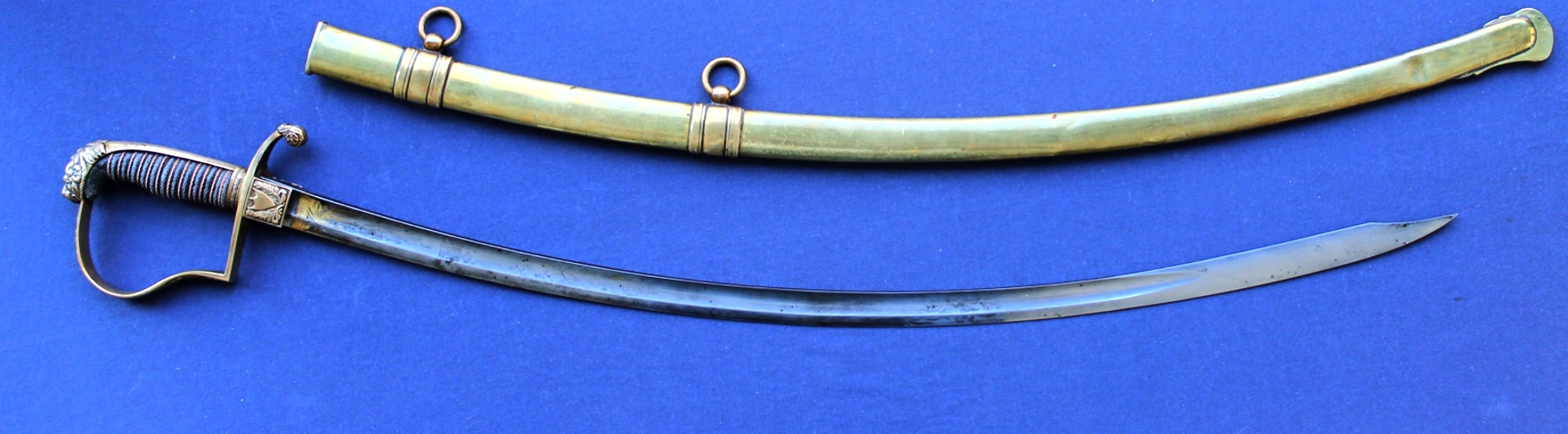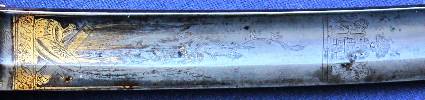 Gekrümmte, gekehlte Rückenklinge mit beidseitiger Hohlbahn und Pandurenspitze mit Signatur des Hamburger Schwertfegers J. C. Northmann jr. Reste der Vergoldung und Bläuung noch vorhanden.