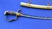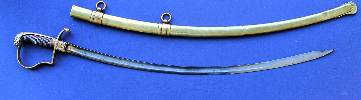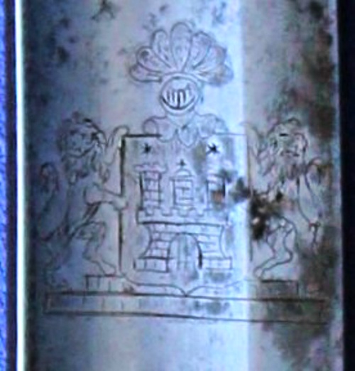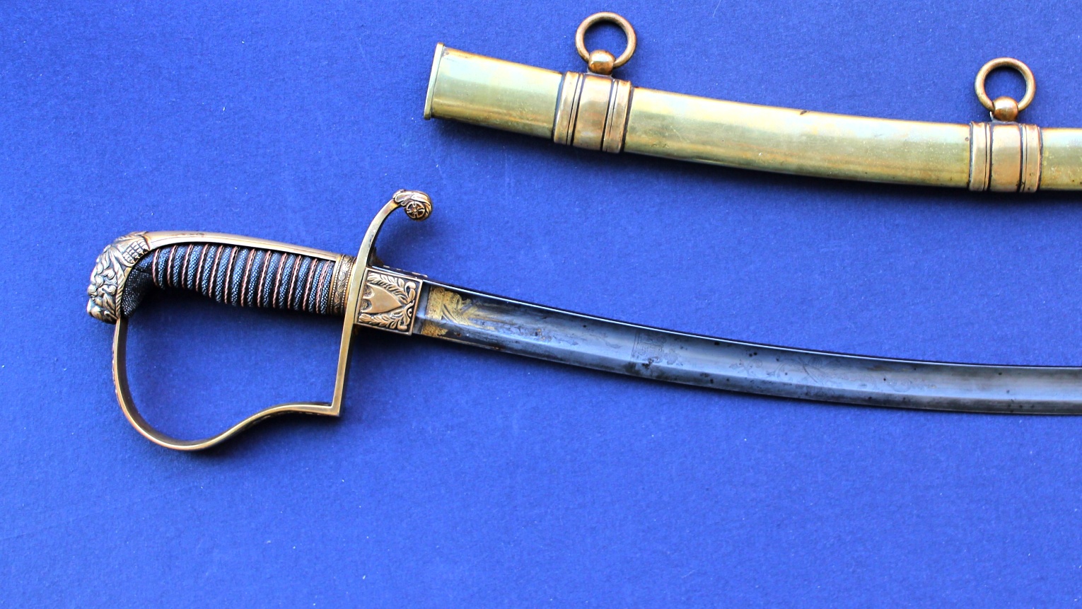 Messing-Bügelgefäß verziert mit Blattwerk. Nach unten abgebogene Parierstange in eingerolltem Endknopf auslaufend und mit einem Hanseatischen Tatzenkreuz verziert. Auf den viereckigen Parierstangenlappen außen ein leerer Wappenschild in Schweizer Form, umrahmt von einem Lorbeerkranz. Der innere Parierstangenlappen mit umlaufender, feiner Zierlinie graviert. Verzierter Griffring und glatte, ganze Griffkappe mit flachem Löwenkopf-Knauf im Genick mit gekreuzten Pratzen. Gebauchte und gerillte Griffhülse mit Fischhautüberzug und zwei feinen Lagen gegenverdrillter Drahtwicklung.