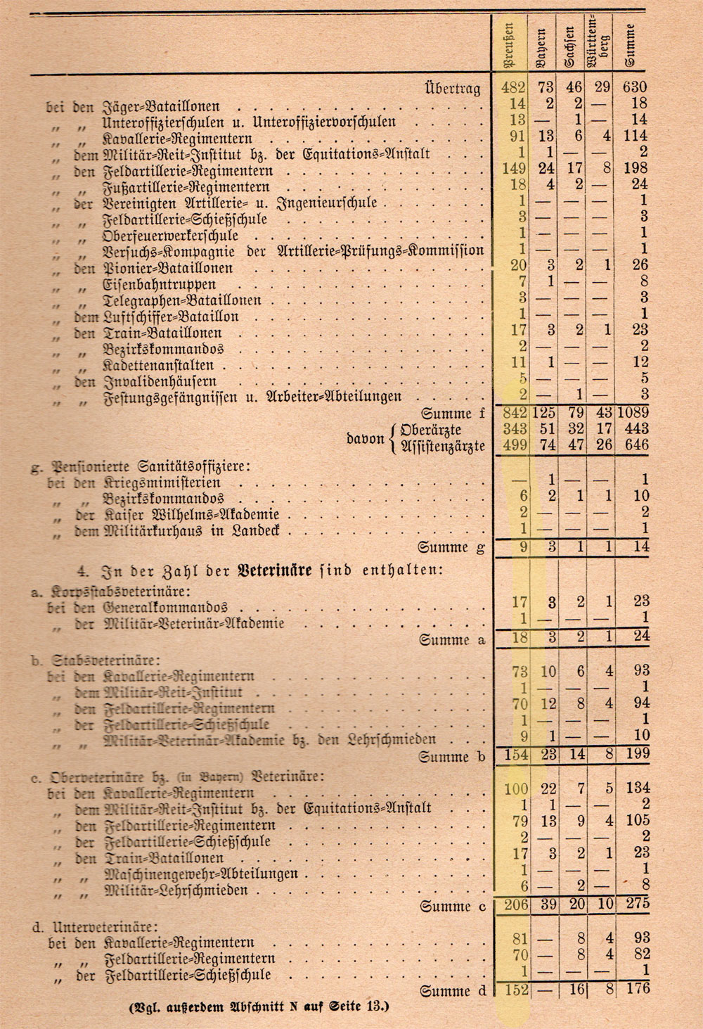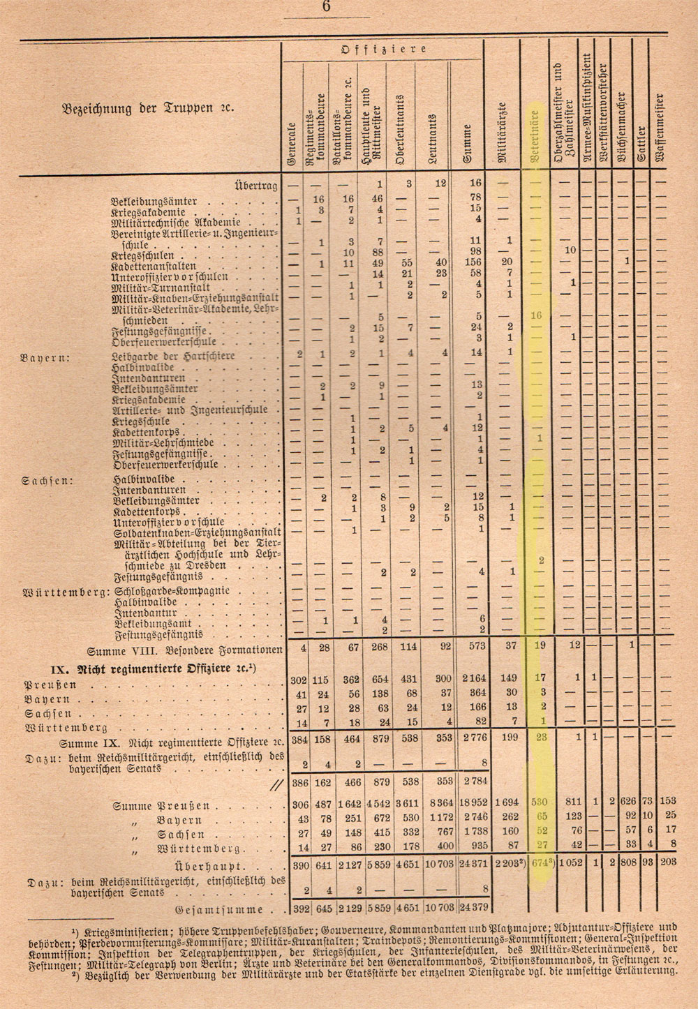 Zu Kaisers Zeiten, als die Kavallerie noch etwas nutzte und deshalb etwas galt, war eine bestimmte Spezies der Portepeeträger für das Wohlergehen der edlen Vierbeiner verantwortlich: die Veterinäre, kurz "Roßärzte" genannt. 680 von ihnen hatten anno 1901 die 104 485 Streitrösser des preußischen Heeres zu betreuen, das sind etwa 154 Vierbeiner pro Zweibeiner.”
