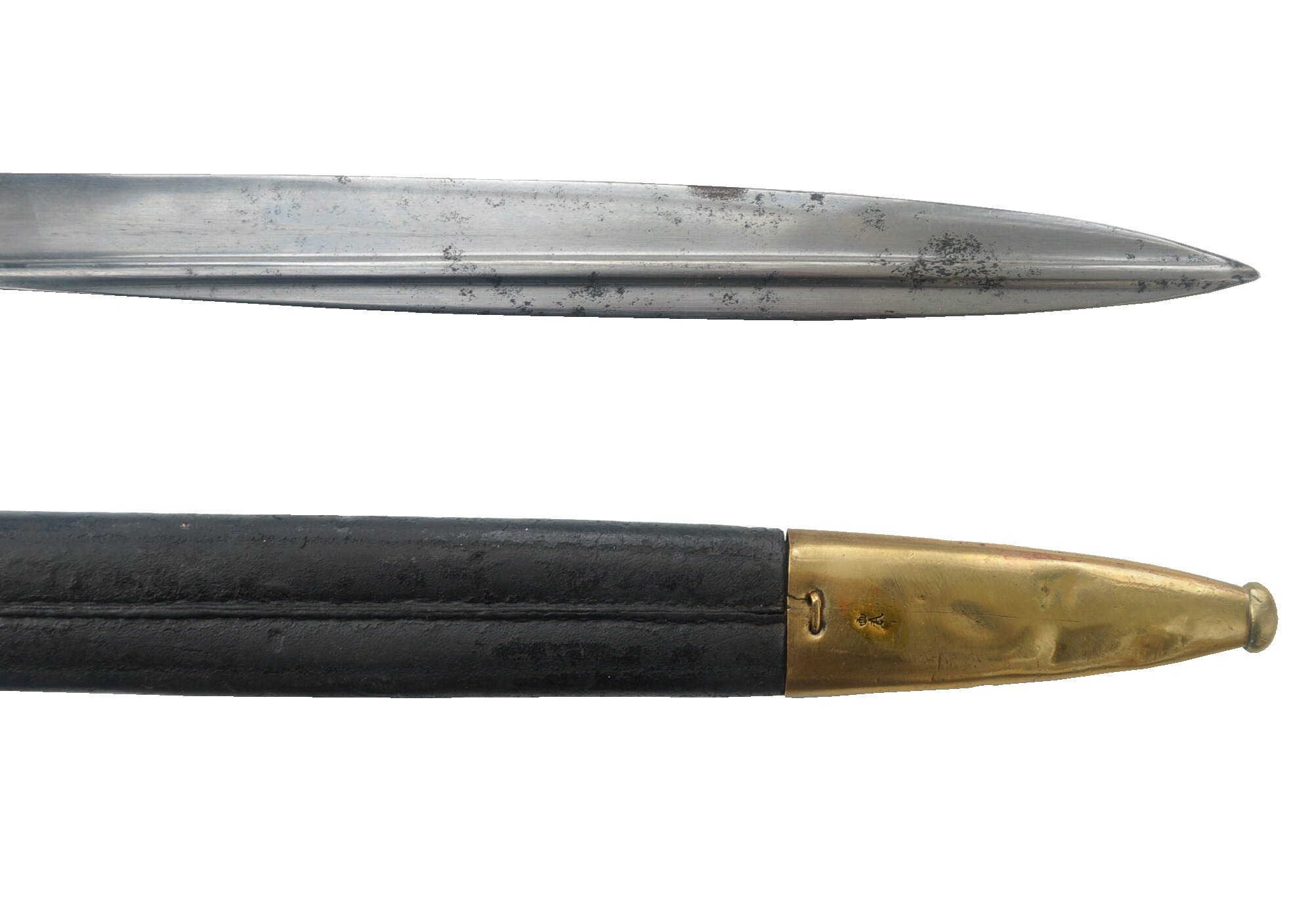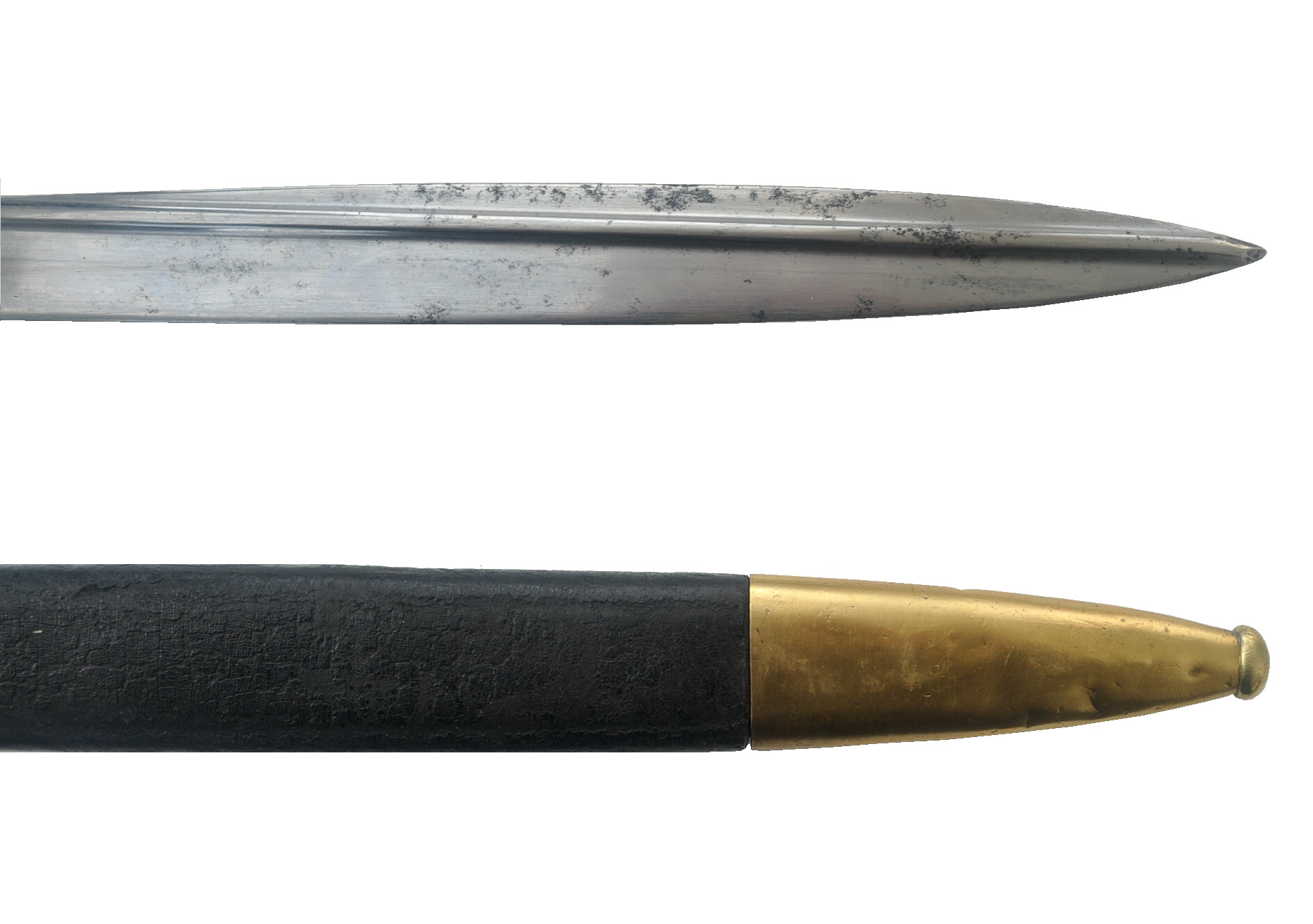 schwarze Lederscheide mit Messingblechbeschlägen, Ortknopf
