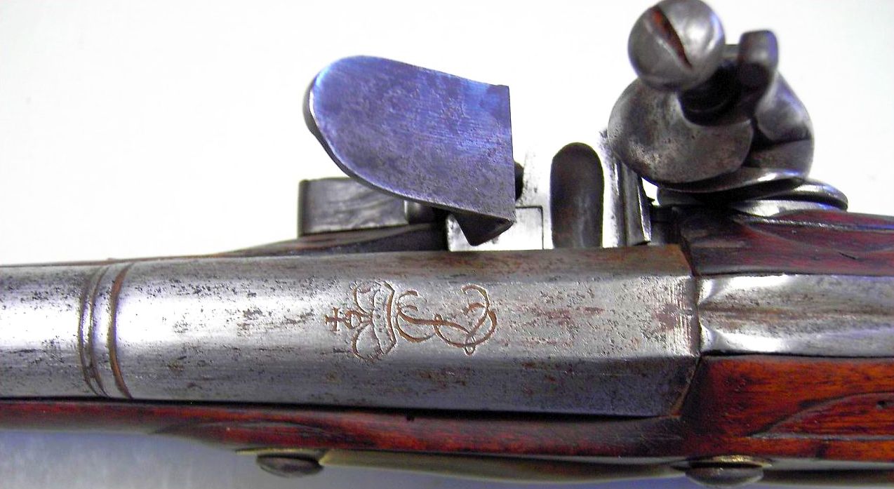 Wäre die Pistole in Potsdam produziert worden, könnte man dies sicherlich anhand dann vorhandener Stempelungen oder Signaturen leicht feststellen, auch eine Fertigung in Suhl, Lüttich oder Essen mit den bekannten, jeweils geschlagenen Stempelmarken könnte man sicherlich problemlos identifizieren. Eine Fertigung durch Johann Jakob Behr, wie dies bei zwei anderen, bekannten Darmstädter Pistole der gleichen Zeit nachgewiesen werden konnte, ist ebenso unwahrscheinlich, da entsprechende Hinweise an der Waffe fehlen. Auch Pistor in Schmalkalden kann keine Option sein, weil diese Manufaktur im fraglichen Zeitraum noch gar nicht existiert hat. So bleibt eigentlich nur noch die in der Nähe von Suhl gelegene Produktionsstätte Zella-St.Blasii. Tatsächlich findet sich an der Laufunterseite eine kleine, wenn auch ziemlich verwaschene und daher undeutliche Marke, die man mit etwas gutem Willen als zweizeiliges „ZEL“, also „ZE“ über „L“ deuten kann, welches so für Zella in den Jahren ab etwa 1710 nachweisbar ist.