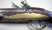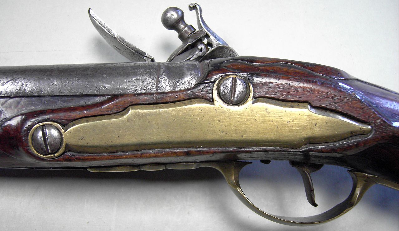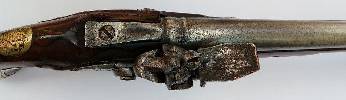 Dunkler Nussbaumvollschaft mit ovalen Verschneidungen um Schloss, Schlossgegenblech und Schwanzschraubenblatt. Messingbeschläge, bestehend aus halbem Vorderschaftband, zwei kantigen, an den Enden gewulsteten Ladestockröhrchen, einteiligem Abzugsbügel mit hinterer und vorderer Verlängerung, Kolbenkappe mit langen seitlichen Sporen und ovalem Nagel sowie flächigem Schlossgegenblech mit abgeschrägten Kanten für zwei Schrauben. Auf dem Kolbenrücken ovales Daumenblech aus Messing mit Wappen der Freien Reichsstadt Nürnberg.. Steinschloss mit flachem, an den Kanten abgeschrägtem Schlossblech, ebensolchem Schwanenhalshahn und Eisenpfanne, diese facettiert und ohne Verbindung zur Batterie. Keine Herstellersignatur auf dem Schlossblech außen. Die Batterieschlagfläche oben gerade abgeschnitten und aufgefüttert. Runder, am Pulversack kanellierter Lauf mit eingefeilter Kimme im Schwanzschraubenblatt. Messingkorn auf dem Lauf, 30mm hinter der Mündung. Suhler Schmiedemarken „SUL“ an der Laufunterseite. Auf dem Schwanzschraubenblatt „Suhler Henne“ mit „LM“, eine weitere Marke „Suhler Henne“ mit "CN“ zwischen den Schenkeln der Batteriefeder. Hölzerner Ladestock mit konisch erweitertem Kopf ergänzt. Lauf/Schaft-Verbindung durch Kreuzschraube und zwei Stifte/Ösen.