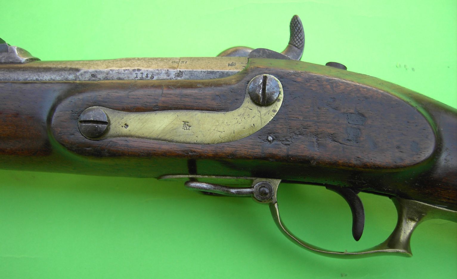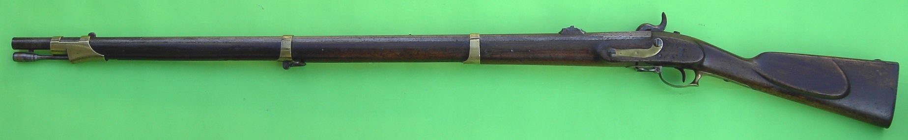 Dunkelrotbrauner Nussbaumschaft mit Backe am Kolben links.. Messingbeschläge, bestehend aus drei rechtsseitig federarretierten Laufringen, Abzugsbügel und flachem, s-förmigem Schlossgegenblech. Kolbenblech aus Eisen. Neukonstruiertes, in den Schaft bündig eingelassenes Perkussionsschloss entsprechend dem Schloss des preußischen Infanteriegewehrs M/39, Schlossblech links vom Hahn abgerundet. Runder, am Pulversack kantiger Lauf ohne Züge mit Patentschwanzschraube und an dieser integriertem Pistonsockel. Standvisier auf der Verlängerung der Schwanzschraube ohne Kimmeneinschnitt, Standvisier in Schwalbenschwanzpassung auf dem Lauf, 100mm vor dem Laufende; eisernes Korn auf dem Lauf, es ragt in den hinteren Bund des ersten Laufrings hinein. Bajonettwarze an der Laufunterseite. Herstellersignatur „SUHL S&C“ unter Krone auf dem Schlossblech außen. Fertigungsjahr„1850“ auf dem Lauf oben links an der Nahtstelle zwischen Patentschwanzschraube und Lauf. „SA“ (Sachsen-Anhalt) an der Patentschwanzschraube oben. Kein Truppenstempel, kein Superrevisionsstempel am Kolben. Kontrollstempel „Kr“ an allen Beschlagteilen, an der Patentschwanzschraube links oben, Seriennummer „1185“ auf der Nase des Kolbenblechs und am Lauf links . Alle Eisenteile mit 50-60%iger Bräunierung. Originaler eiserner Ladestock mit tüllenförmig erweitertem Setzkopf und Endgewinde.