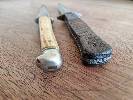 Ich lud auch meine Schwester zum Mal auf das Haus und erklärte ihr die Bedingungen. Sie wandte sich an meinen Vater und dieser gab ihr einen Dolch mit Hirschhornschalen mit, dem ihm ein Mandant als kleines Rechtsanwaltshonorar überlassen hatte. So trafen die beiden Stücke wohl zum ersten Mal im dunklen Gewölbekeller meiner Verbindung zu einem wilden Bankett aufeinander. Das fröhliche Fest ist lange verklungen, doch die beiden Dolche sind mir mit den Erinnerungen geblieben. Der mit Holzgriffschalen öffnet mir seit Jahrzehnten Briefe – er bekam zwischenzeitlich Konkurrenz von gewissen Grabenarbeiten, aber er konnte sich behaupten und seinen Arbeitsplatz behalten. Der andere ziert als Kastanienritzer die Messerzeile, wobei diesem der benachbarte Nicker diese Arbeit mittlerweile mit Erfolg streitig gemacht hat.