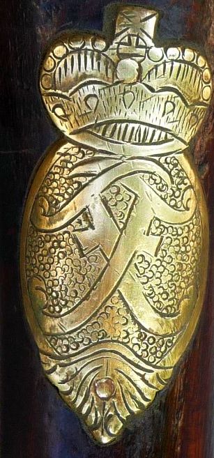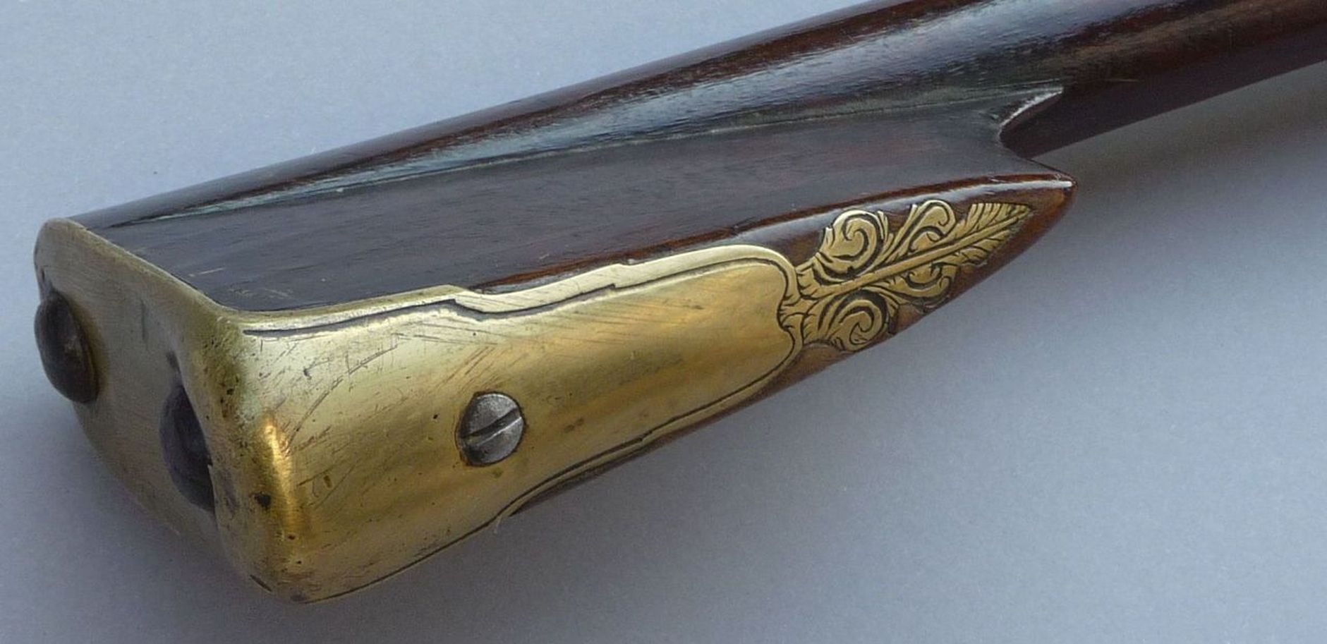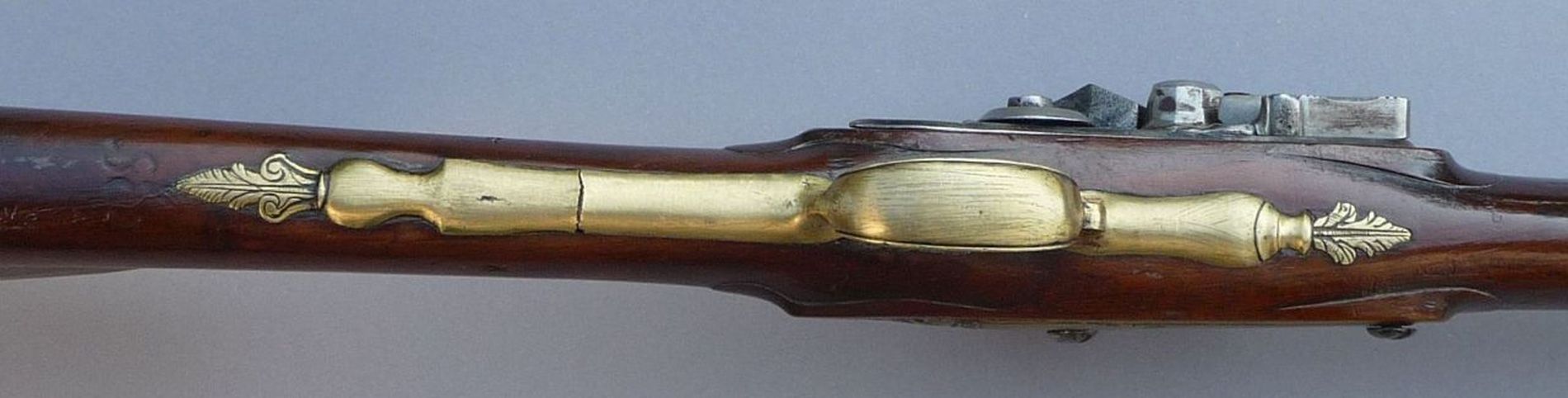 [I]Fast gerader Nussbaumvollschaft mit ausgeprägtem Kuhfuß Kolben und Messingbeschlägen, diese bestehend aus vier doppelt kannelierten Ladestockröhrchen, einem halben Mündungsband, einteiligem Abzugsbügel mit vorderer und hinterer Verlängerung, Kolbenkappe mit einfach verschraubter, oberer Verlängerung und zwei großen Schrauben an der Unterseite, bekröntem Daumenblech mit gegeneinanderstehenden Monogramm „F“ für Markgraf Friedrich III. sowie Schlossgegenblech für zwei Schrauben. Trageriemenösen am Abzugsbügel vorne und am Vorderschaft. Auf der gesamten Länge runder Lauf mit Kannelierung am Pulversack und Bajonettwarze an der Laufunterseite kurz hinter der Mündung. Steinschloss mit flachem Schlossblech und entsprechendem Schwanenhalshahn. Eiserne Pfanne mit hahnseitigem Feuerschirm ohne Verbindungssteg zum Batterielager. Die Schlagfläche der Batterie nach preußischem Vorbild oben gerade. Eiserner, konischer Ladestock mit Endgewinde und Messingummantelung am Stoß Kopf.„6“ am Schaft links oben, sonst keinerlei sichtbare Marken oder Signaturen.