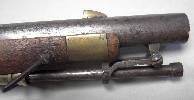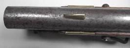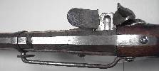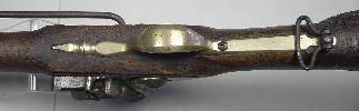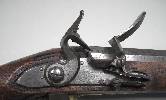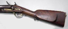 Nussbaum-Vollschaft mit Backe am Kolben links. Messingbeschläge, bestehend aus einer Vorderschaft-Halbschale mit Ladestocktülle, Schlossgegenblech für zwei Schrauben mit Verlängerung und Abzugsbügel Unterbügel aus Eisen und Kolbenkappe. Eiserne Sattelstange mit eisernem Laufring und auf der Stange beweglicher Ring für den Karabinerhaken. Steinschloss mit flachem, an den Kanten abgeschrägtem Schlossblech, ebensolchem Schwanenhalshahn, und eiserner Pfanne mit Verbindungssteg zum Batterielager. Kurz hinter der Mündung an der Laufunterseite angebrachtes Gelenk für einen eisernen Ladestock. Im hinteren Drittel auf 260mm kantiger, mit Baluster in rund übergehender Lauf. Kimme in das Schwanzschraubenblatt eingefeilt, halbmondförmige Standkimme auf dem Lauf