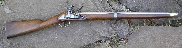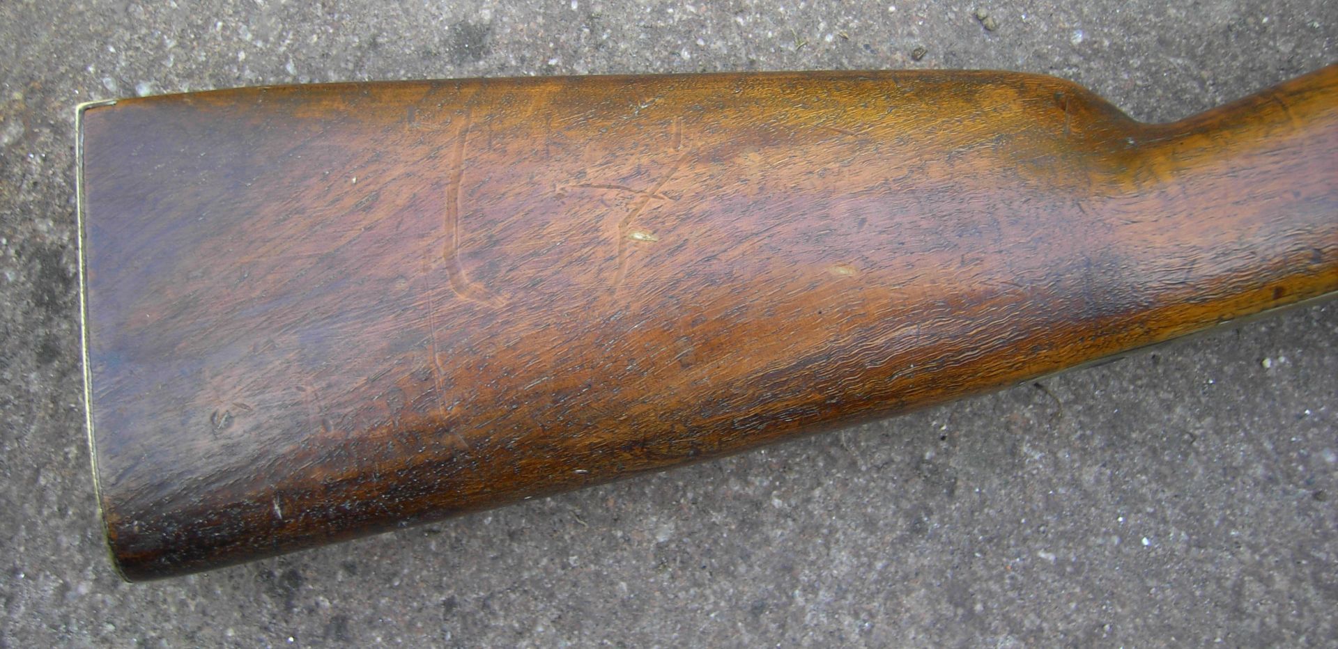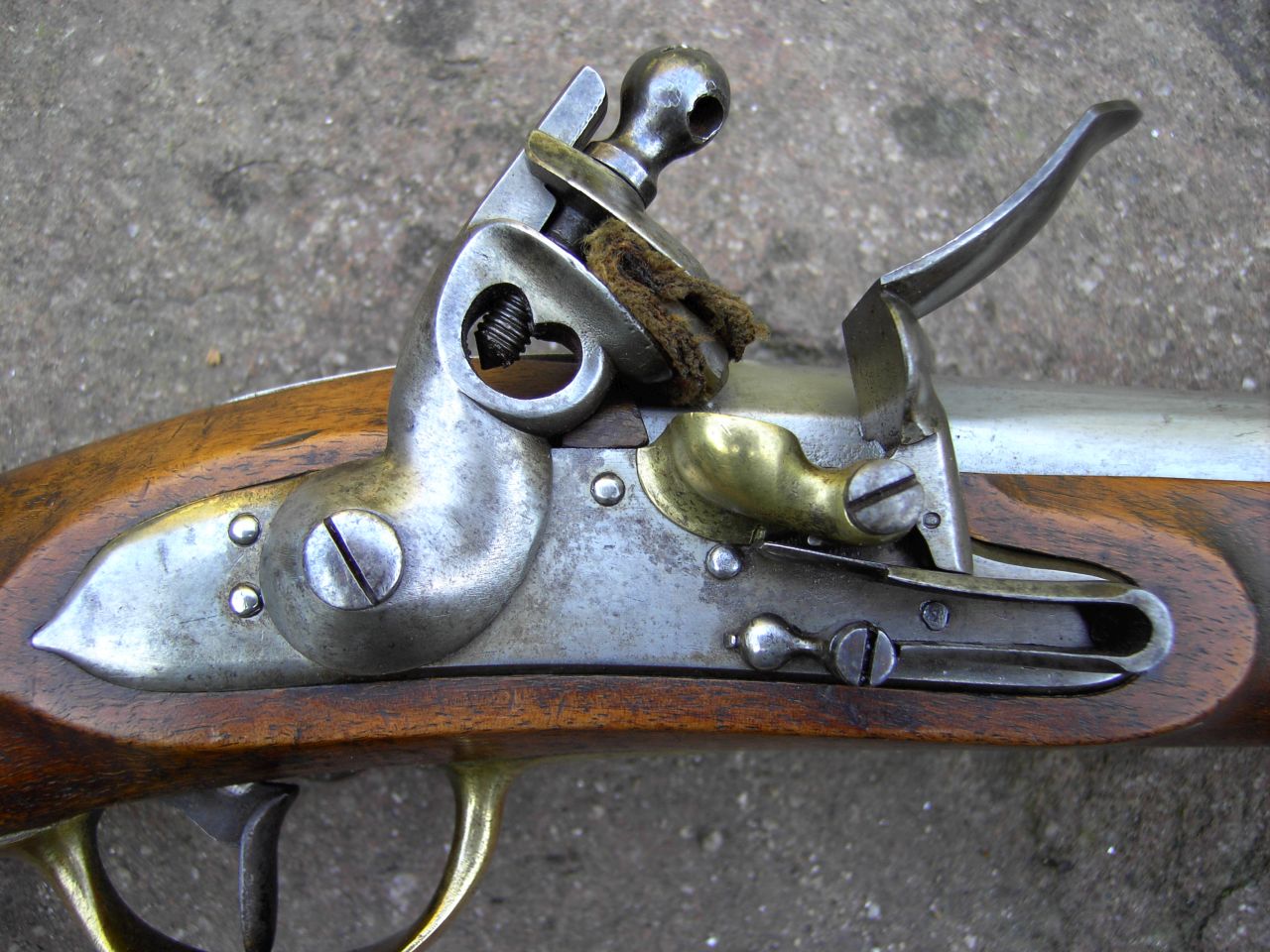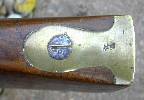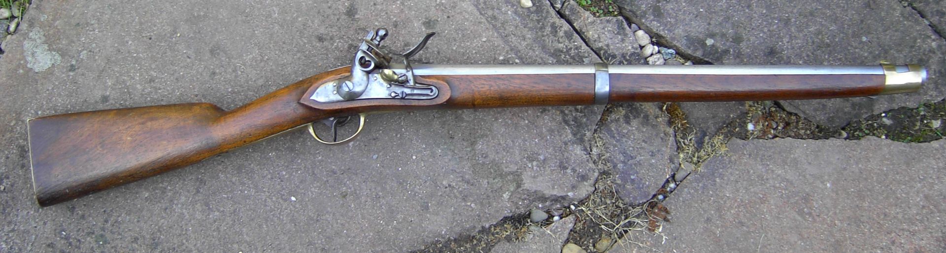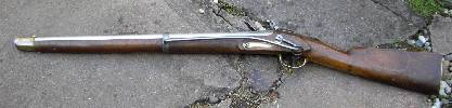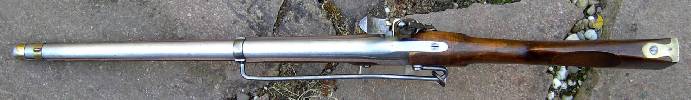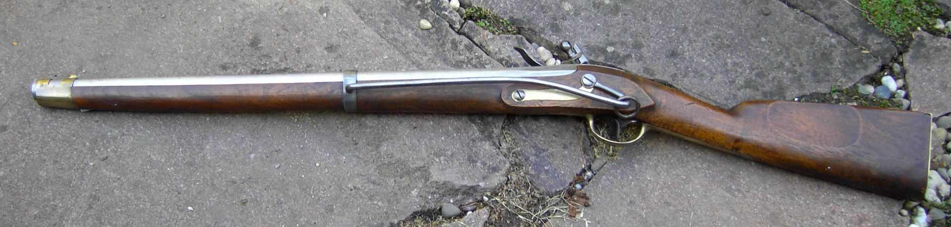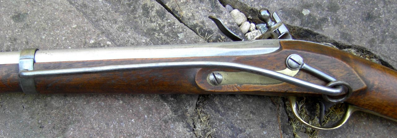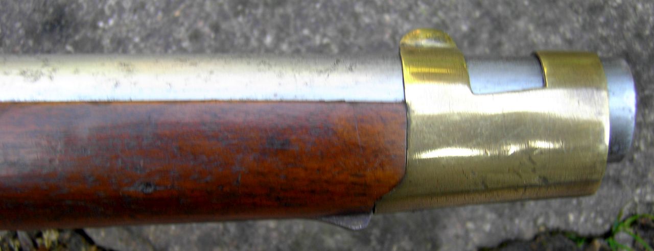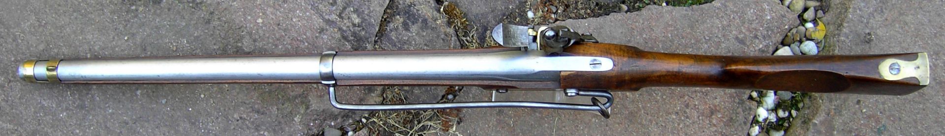 Nussbaum-Vollschaft mit Wangenhöhlung am Kolben links. Messingbeschläge, diese bestehend aus von unten federarretiertem, doppelbündigem Laufring, Messingkorn auf dem hinteren Bund, zweitem Laufring mit angelöteter Sattelstange, die bis zur hinteren Schlossschraube reicht, hinten verschraubtem, vorne gestiftetem Abzugsbügel, Kolbenkappe und s-förmigem, flachem und bündig im Schaftholz verlegtem Schlossgegenblech. Runder, am Pulversack seitlich abgeflachter Lauf mit gerundetem Schwanzschraubenblatt. Im linken Bereich gewölbtes Schlossblech mit ebensolchem Herzhahn. Die Batteriefeder reicht über den Schlossschraubengewindegang. Gegossene Messingpfanne nach französischem Modell an 9. Die Batterie oben nach vorne abgewinkelt. Keine Kimme. Herstellersignatur „Rosch“ am Pulversack oben links.