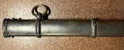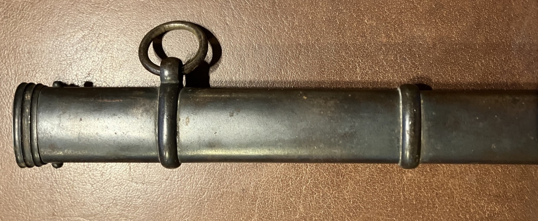 ist zu schmal, letztes drittel vom Degen ging nicht rein, wahrscheinlich eine Scheide für ein Privat beschafften Degen mit schmalerer Klinge, keine für ein Kammerstück mit wuchtigerer Klinge.