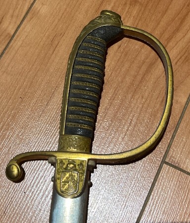 Das hier gezeigte Modell für EL gibt es in drei Ausführungen. Einmal mit dem Wappen EL und einmal mit Feuerwehrmotiven, wobei letztere nicht EL sein muß. Hinzu kommt noch eine gelbmontierte Ausführung mit dem bayerischen Löwen im Parierstangenlappen.