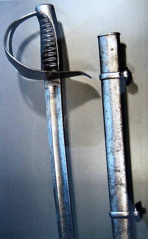 Klinge einschneidig, an der Spitze zweischneidig mit breitem Hohlschliff. Eisengefäß, Nackenstück mit Längsrillen. Belederte Griffhilze mit Messingdrahtwicklung, unterer Abschluss mit Ring und Öse für einen Zeigefingerriemen. Eisenscheide mit zwei beweglichen Trageringen. Lieferung von Frederiksværk von 1843-1851 an die Dänische Armee: 5.287 Säbel (Fotos: Felsen).