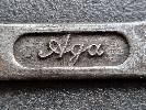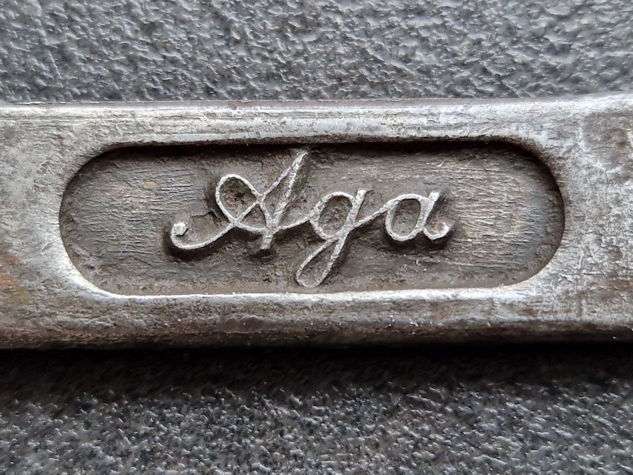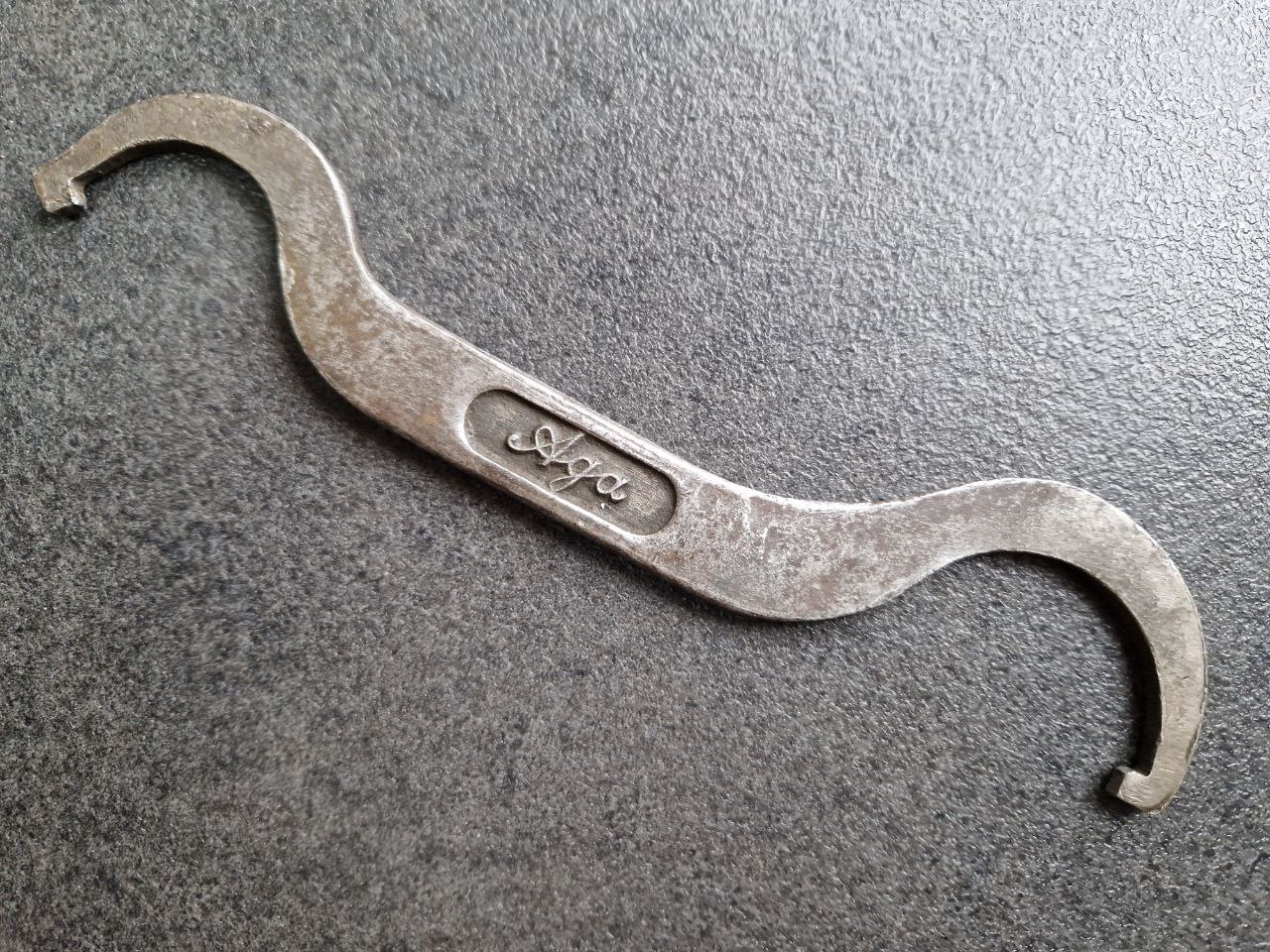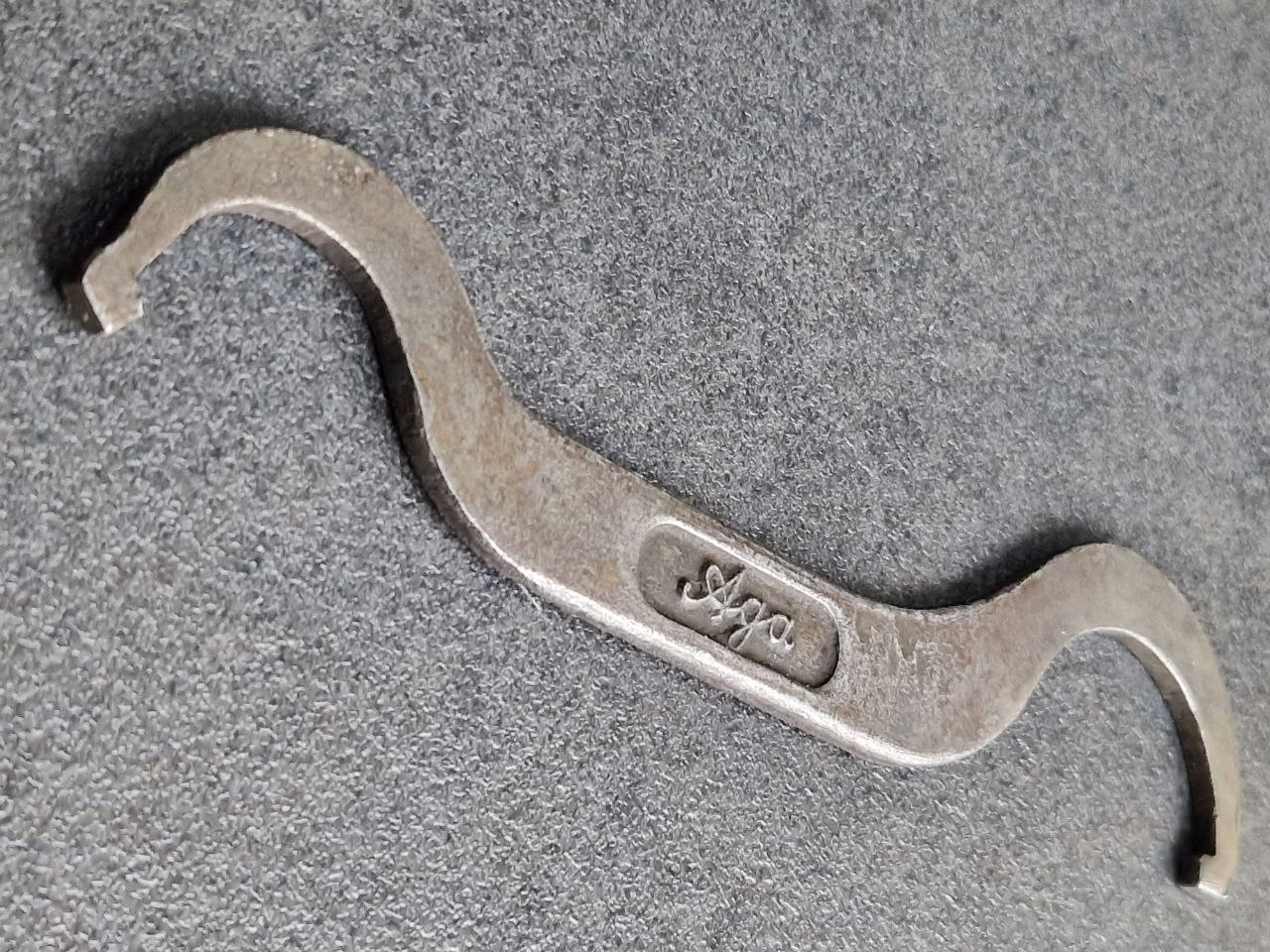 Aktiengesellschaft für Automobilbau, kurz A.G.A, beginnen 1909 als Autogen-Gas-Akkumulator-AG. 1919 stieg die Firma in den Automobilbau ein und benannte sich 1920 auch zur "Aktiengesellschaft für Automobilbau" um. 1924 ereilte die Firma der erste Konkurs, 1927 produzierte die „Aga Fahrzeugwerke GmbH“ noch als Nachfolger weiter, allerdings folgte 1929 das endgültige Aus. Die A.G.A stellte insgesamt an die 10.000 Fahrzeuge her. Dementsprechend selten zeigt sich dieser 141 Gramm schwere und 222 mm lange Hakenschlüssel im Verkauf: Aufgrund der Aufschrift „Aga“ statt