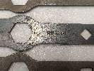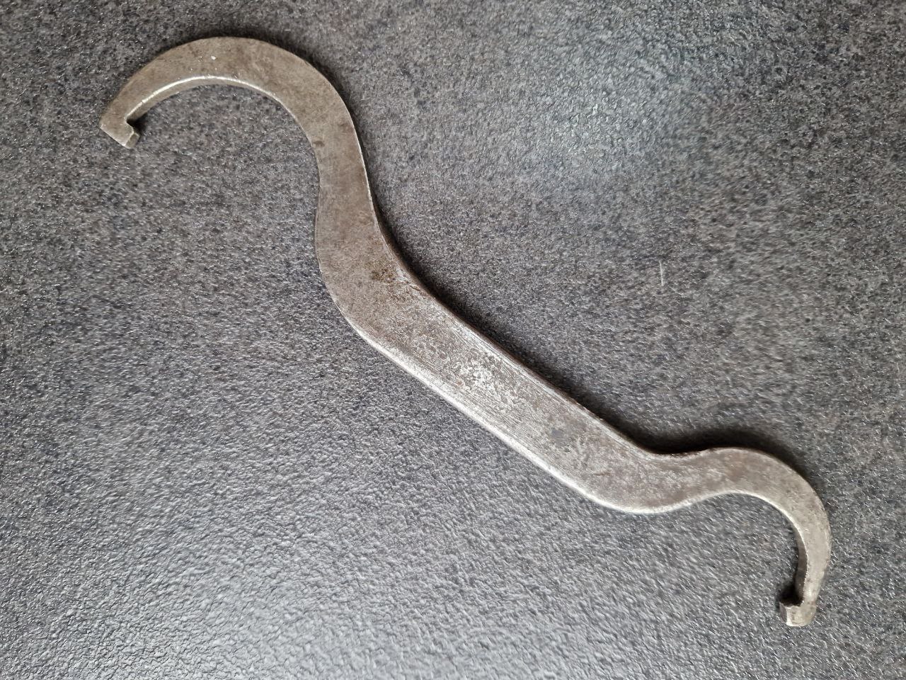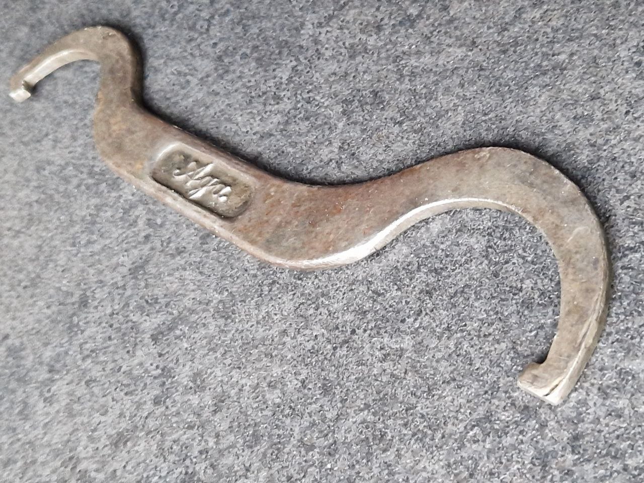 Dieser etwas rostzerfressene Hakenschlüssel von Horch mit 393 Gramm Gewicht und 292 mm Länge ist auf alle Fälle nicht dünnwandig. Er trägt die Markierungen "37" HORCHWERKE A.G. 33." sowie "37. ZWiCKAU i/SA. 33.". Ich finde es ja witzig, dass von all diesen noblen und edlen Karossen in den meisten Fällen am Ende - wenn überhaupt - nur die Werkzeuge übrig geblieben sind.