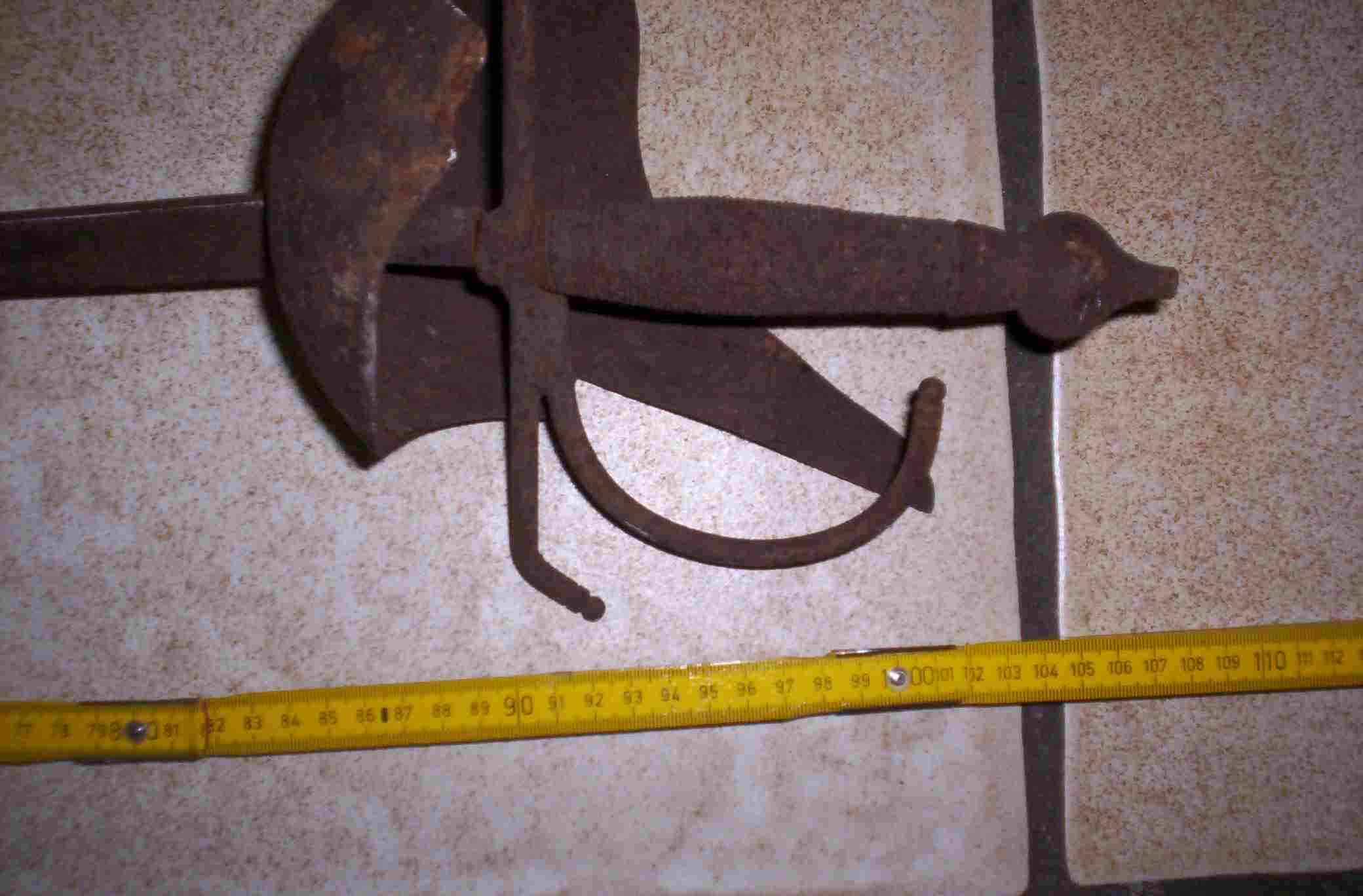 willkommen im Forum. Vorweg, ich hätte gern Fotos gesehen, als der Degen noch im Baum stach. Ich überlege hin und her, kann es mir aber nicht vorstellen, wie so ein Teil schräg in einem Baum verwachsen kann. Diesen Degen hätte man nämlich nicht einfach so in den Baum stechen können. Der beschriebene Baum bräuchte auch mehrere hundert Jahre, um zu diesem Durchmesser anzuwachsen. Bis dahin wäre vom Degen nichts mehr übrig gewesen.