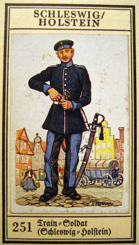 das Sammelbild zeigt einen Soldaten mit einem Blüchersäbel, der in die Zeit ab 1897 zu datieren ist. Zu dieser Zeit gab es das Schleswig-Holsteinische Train-Bataillon Nr. 9 und das Traindepot in Rendsburg.